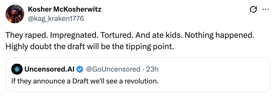 >>2722992partially correct. the difference between things right now and the possibility of a draft is that a lot of americans are clearly still stuck in a "not my problem"/"someone else will fix it" mindset. like the Epstein shit has clearly been a huge PR hit, to put it mildly, to the Trump regime on top of everything else they've been doing, and in places like Minneapolis where people's lives are being directly affected there's been efforts to mobilize against the worst excesses of the regime. a draft would change this completely where not only are americans being fucked over in every possible way by an oligopoly of literal Satanic pedophile billionaires, but then in that case they would also be getting told to die in a deeply unpopular war for our closest ally who has been openly doing a genocide for the past few years. again to put it mildly, this would significantly disrupt the "not my problem" mentality that is probably one of the biggest things preventing americans from getting their shit together and organizing.