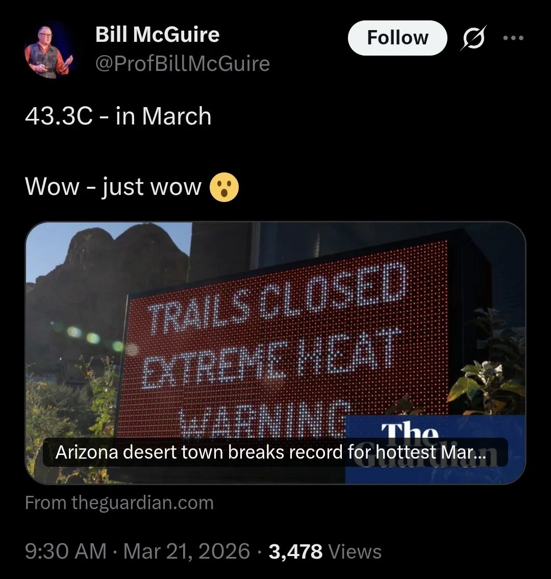 Earth is now heating up twice as fast as in previous decades: Study https://ground.news/article/earth-is-now-heating-up-twice-as-fast-as-in-previous-decades-study_63acf6Humanity heating planet faster than ever before, study findshttps://www.theguardian.com/environment/2026/mar/06/humanity-heating-planet-faster-than-ever-before-study-findsMicroplastics found in 90% of prostate cancer tumors, at much higher levels than healthy tissues, study reveals https://www.sciencedaily.com/releases/2026/02/260225001250.htmWas War with Iran Sparked by Water?https://erickeyser.substack.com/p/was-war-with-iran-sparked-by-water?r=1r05cx&triedRedirect=true&_src_ref=old.reddit.comThe Iran War Is Also a Climate Warhttps://www.thenation.com/article/environment/iran-war-climate-change/Microplastics found in 90% of prostate cancer tumors, study reveals The Billionaire Heist: Why the extraction of our 'labor energy' is leading us toward a global crisishttps://www.youtube.com/watch?v=iri_xg4rj_k>>2724691Because its le historically progressive.