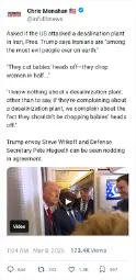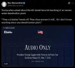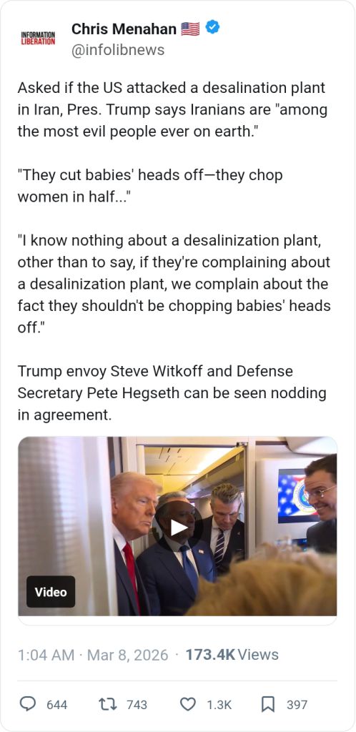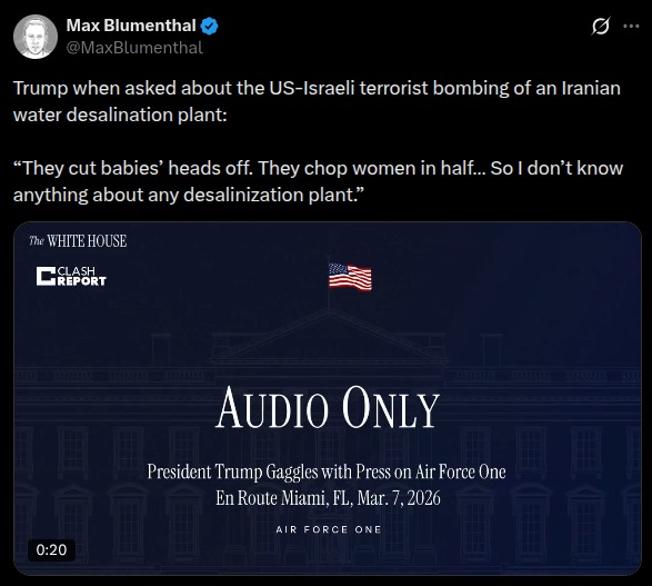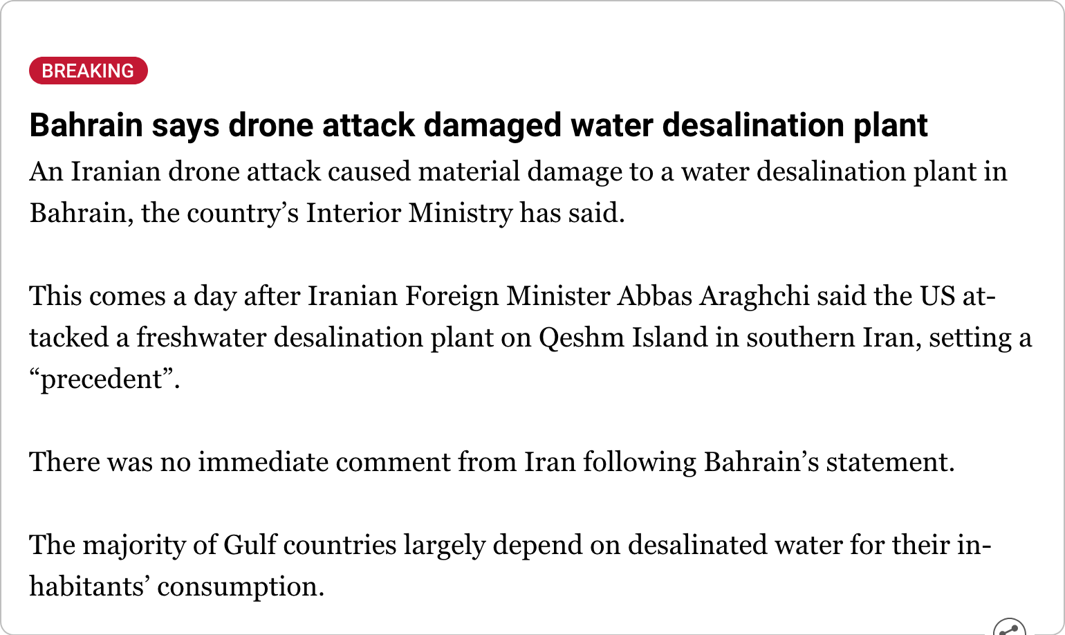 Israel/america struck desalination plants. The streets of Tehran are slicked with burning oil. Even the water is on fire. The white house is intervening to stop investigations into retaliatory terror. They could be planning a false flag. The possibility that this takes the form of the nuclear option is not unimaginable. If everything continues to goes wrong here, they will nuke Iran. There is a chance this stays in the low yield tactical range; but once the line is crossed, who knows. If the nuclear winter hypothesis is at all correct, the proceeding nuclear winter will affect the whole planet. What's left of Iran will strike desalination plants in the UAE and then their oil fields; and place mines in the strait. Those oil fields will burn for years. When that nuclear winter ends, the methane released from the burning oil fields will cause exponential global heating for at least 20 years; and the carbon a long-term worsening of the climate crisis for the forseeable future.