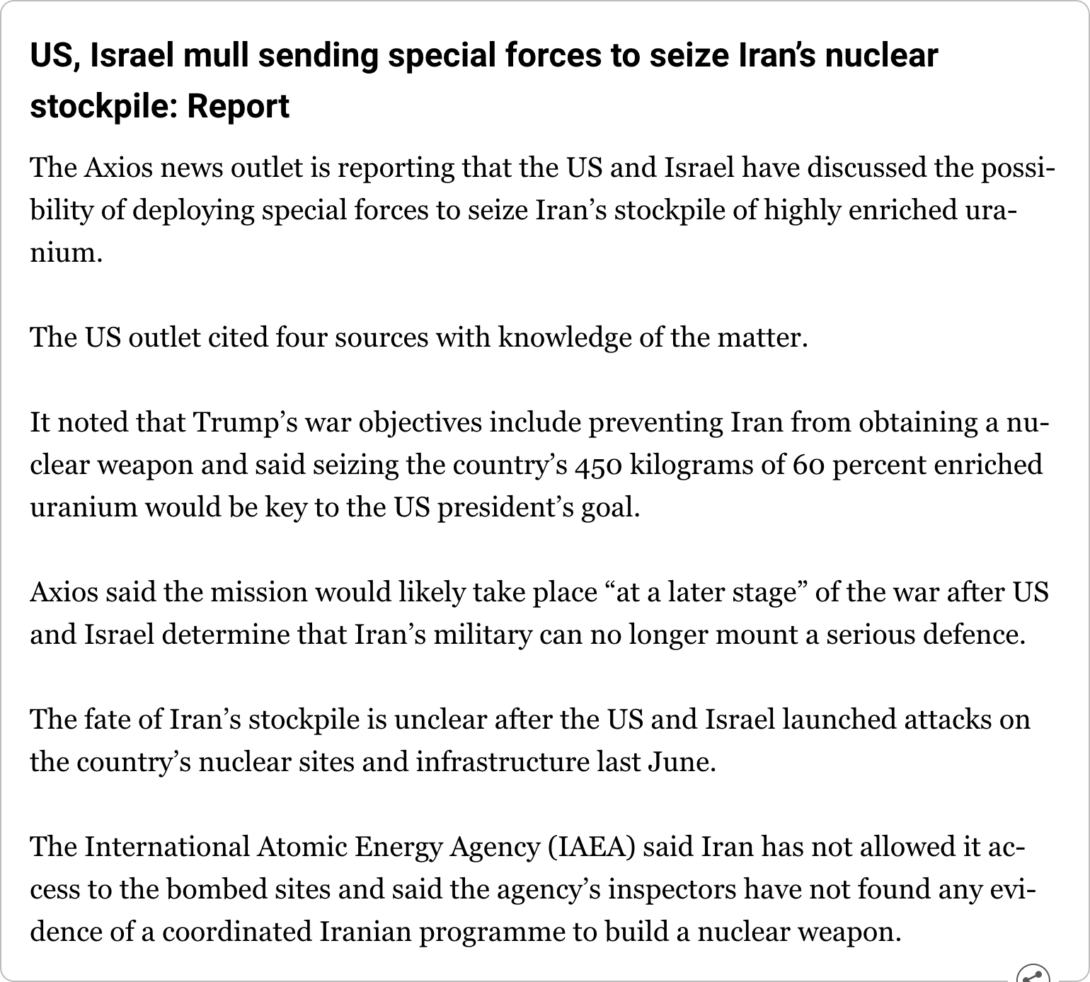 >Both the US and Mossad have admitted that they have a proxy force What proxy force? There are no signs of internal instability in Iran. The ethnic Persian opposition has no organization, no weapons. By all accounts its extremely divided and widely regarded as impotent. Trump has already ruled out some kind of Kurdish Bay of Pigs, and the KRG said they wouldn't cooperate with such a scheme. There is no imperialist ground force being arrayed against Iran.