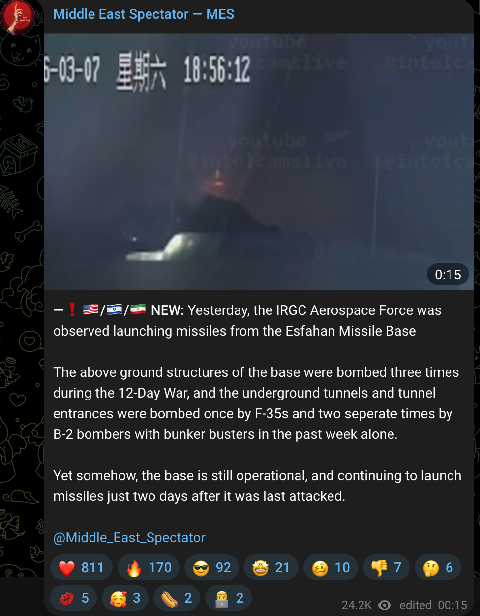 >which is why their launch numbers are in the toilet nowYou still haven't shown this, and other analysts have argued that this is representative of lower interception rates due to low stocks, in turn requiring fewer missiles to inflict the desired damage. This is what Alastair Crook argues, he was a British diplomat in Israel and an ex-MI6 glowie. He says that at present rates Iran's stockpile could last for months, that most of what they've fired now is their old stock, and that their launch capacity is hardened and has not been significantly degraded. He also argues that strict censorship in Israel is restricting a full assessment of the damage. The only claims I've seen that the number of missiles has significantly decreased have come from the US or Israeli militaries. Israel, Iraq, Qatar, the UAE, Saudi Arabia, Kuwait, and Bahrain are all still being hit daily, so clearly the war is not over.
