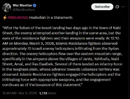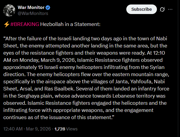 “After the failure of the Israeli landing two days ago in the town of Nabi Sheet, the enemy attempted another landing in the same area, but the eyes of the resistance fighters and their weapons were ready. At 12:10 AM on Monday, March 9, 2026, Islamic Resistance fighters observed approximately 15 Israeli enemy helicopters infiltrating from the Syrian direction. The enemy helicopters flew over the eastern mountain range, specifically in the airspace above the villages of Janta, Yahfoufa, Nabi Sheet, Arsal, and Ras Baalbek. Several of them landed an infantry force in the Serghaya plain, whose advance towards Lebanese territory was observed. Islamic Resistance fighters engaged the helicopters and the infiltrating force with appropriate weapons, and the engagement continues as of the issuance of this statement.”