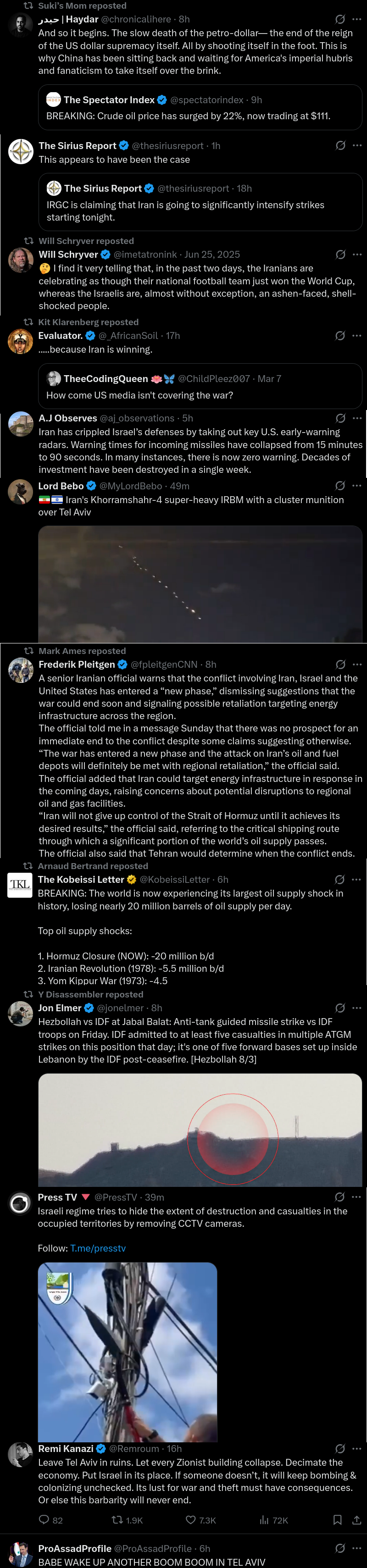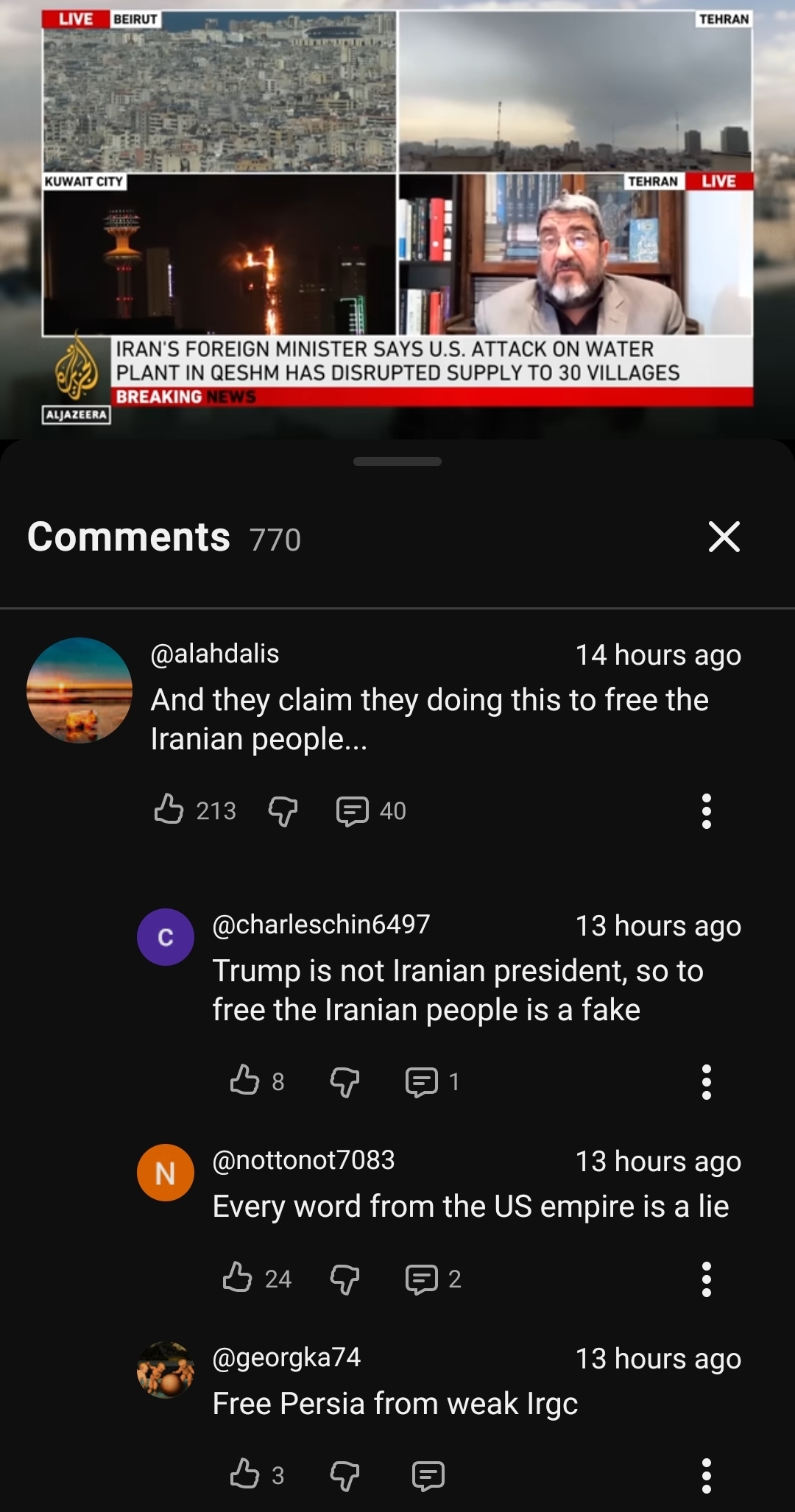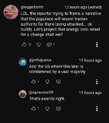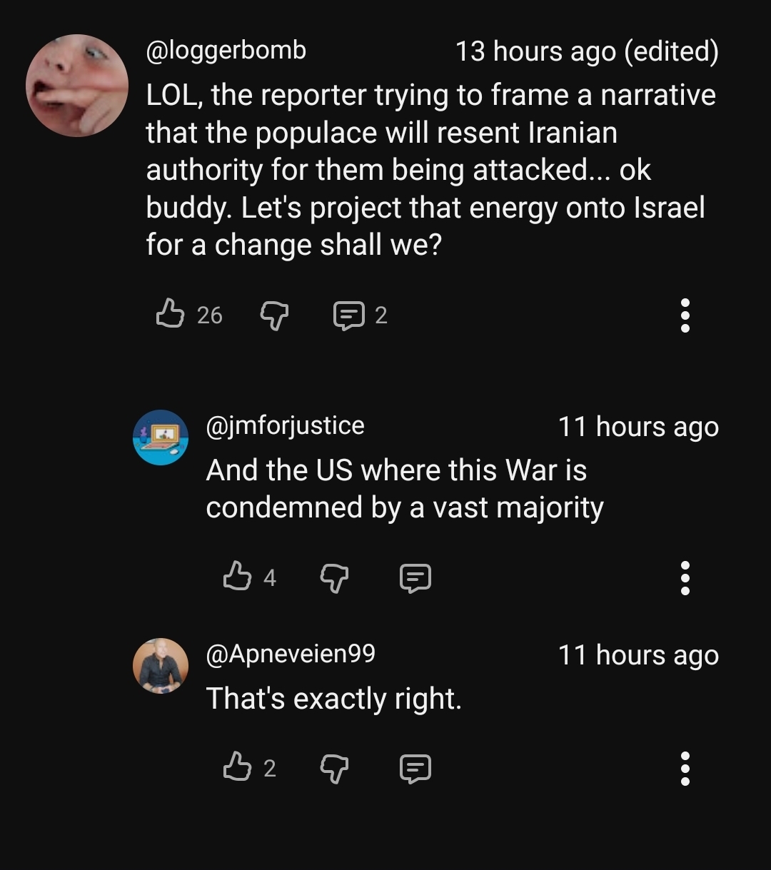 >>2728889There was a thread on /r/worldnews when the war first started and the top voted comment was about how Iranians are barbaric for attacking Israeli civilian infrastructure even though Israel started the war. I commented under it about Israel/US bombing that girls school and got banned from /r/worldnews for "misinformation" and a moderator bot commented under my deleted post about how it was actually an Iranian missile misfire…as reported by Israeli media outlets.