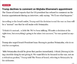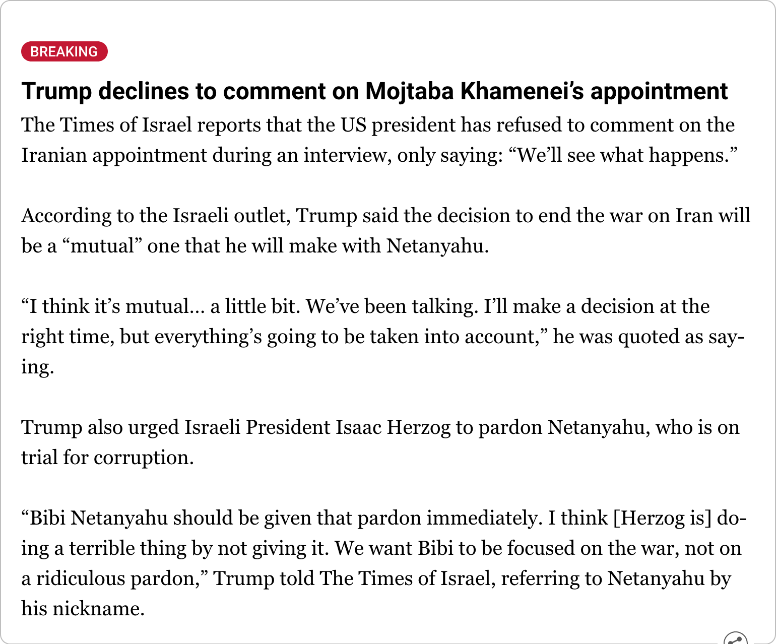 Surely the USA can find and bomb him whenever. Which would probably change nothing by itself… Buuut the dynamic where the USA just gets to "veto" the supreme leader choice, by conflagration, is also the sort of thing this current admin and the MIGA hogs would be into, big time.