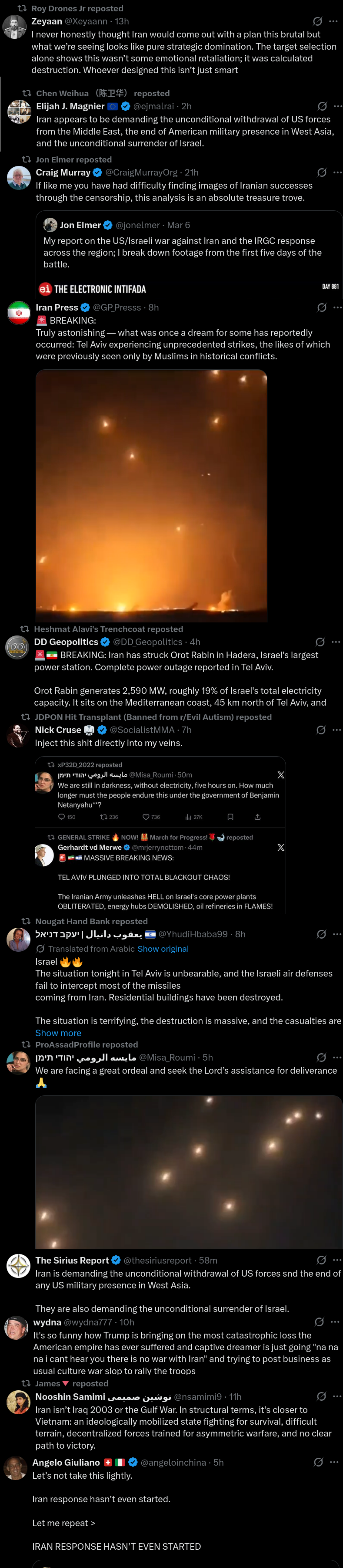 You're utterly delusional. Iran can barely manage single rocket launches against Israel now and uses fewer drones in this entire war than Russia does in 1 night in Ukraine. They are being actively, heavily attrited by US/Israeli airpower.