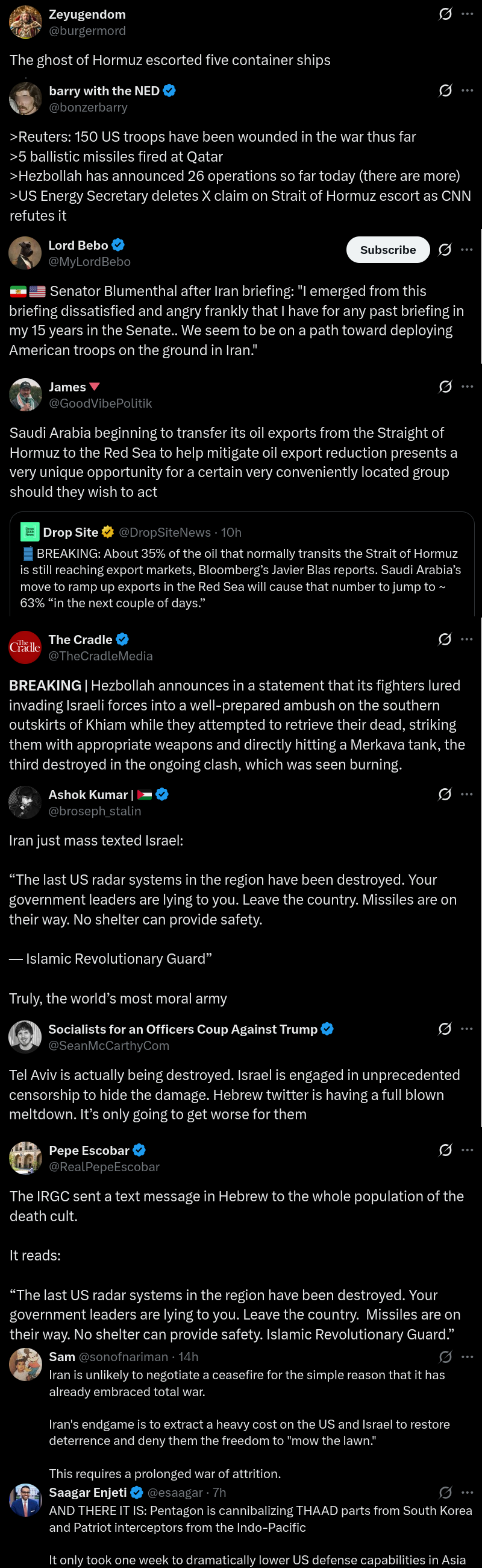 >Oil futures spiked early on Monday — reaching a priceof $120 — and then fell back to around $100 following remarks from Trump that led traders to believe the shutdown of oil flowing from the Persian Gulf could be short-lived. I think there is a lot of denial on Wall Street and among Trump’s most rabid supporters… They believe that Iran’s missile inventory is rapidly depleting and that there are cracks among the Iranian political and military leaders. I believe they are grossly misreading the situation. Iran is not close to depleting its supply of powerful, sophisticated ballistic missiles. Most Americans fail to understand that Iran’s outrage over the 28 February surprise attack is comparable to the fury that seized the United States in the wake of the 1941 attack on Pearl Harbor and the 9-11 attacks in 2001. Iran will continue to attack US and Israeli targets and will not stop until the security of Iran — both economic and military — is secured.https://sonar21.com/growing-doubts-by-us-and-israel-about-the-war-with-iran/ >>2731022>>2731024the 12 day war