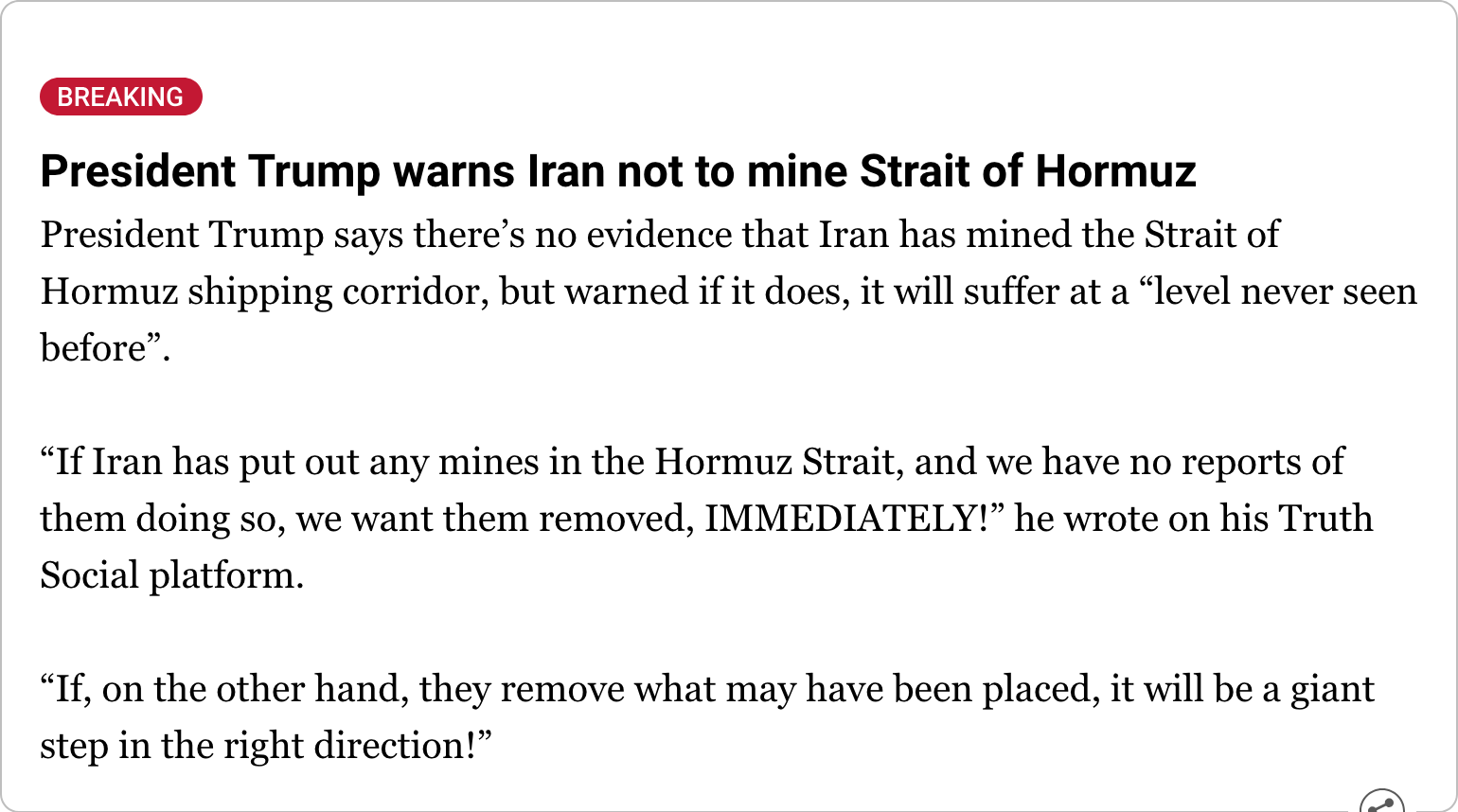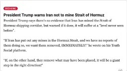 >Yet there is remotely adequate media challenges to deranged Trump messaging, such as show in the (admittedly captive) CBS headline: Trump says “the war is very complete,” and he’s considering taking over Strait of Hormuz. Daniel Davis showed a longer-form version with a long-form version of Trump’s remarks: