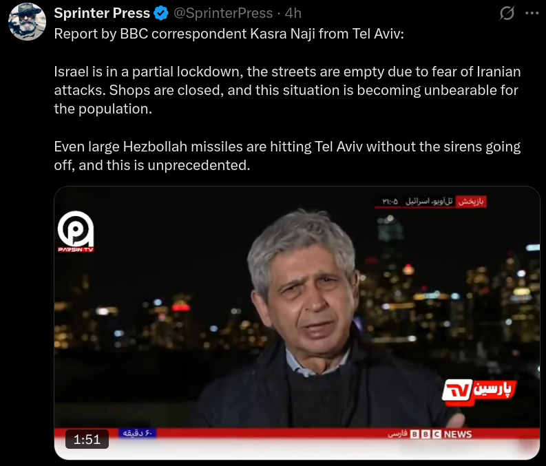 >The Hindustan Times gives a fresh update on the punishment Iran continues to visit on Israel. I bothered by the way the headline and opening section personalizes the escalation but you can listen past that: