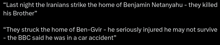 >A final speculation: I am less worried about Israel resorting to tactical nukes than I was earlier. Even though reports that Netanyahu had decamped to Berlin early in the war were debunked, I see no evidence that he has physical courage, much the less is willing to accelerate his demise. The fact that he has almost certainly enabled his son Yair to hide out disgracefully in Miami rather than serve in the IDF is indirect proof. Even if he were manage to be out of Israel when a tactical nuke was launched (would the minders of the Israeli version of the nuclear football tolerate that), he has to recognize by now that either a full blown nuclear holocaust or at least the conventional-weapon-flattening of Israel by Iran would result. Even if he managed to survive, unhappy surviving Mossad operatives would be sure to be out for his head, on top of pretty much all of the rest of the world. I cannot imagine he would live as long as a year.