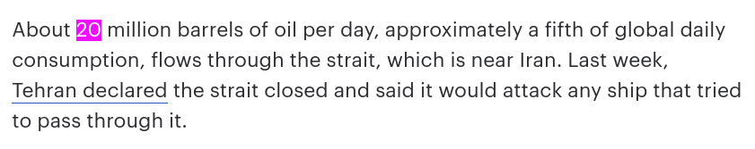 >Foreign Minister Araghch trolled the Trump Administration with his awareness of the power of the energy price whip hand, and that Iran has not only the Strait of Hormuz choke point but also the ability to hit Gulf ports and production facilities:And since the Trump team seems to have trouble with understanding diplo-speak, it has had to communicate more tersely. Bloomberg is getting the message even if the Administration keeps refusing to. Its big banner headline at 7:30 AM EDT: