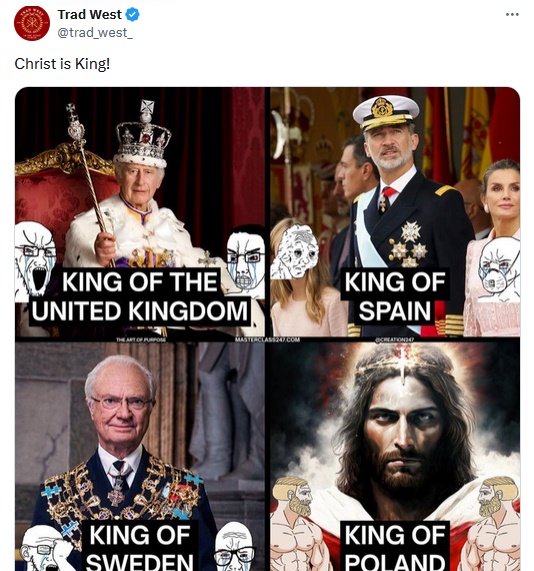 Right now, Christian kings are received like court eunuchs… that even Joe Biden seems to outshine them in Majesty… and compared to Communist leaders? it's not even a contest–political ideology and that kind of civic religion has totally outclassed the divine right of kings in political expedience, majesty & preeminence, and security (which might be hard for many /leftypol/ anons to believe, but looking at how Lenin has so many statues of himself & Stalin or ᴉuᴉlossnW's cult of personality, how Mao is received like a prophet, how North Korea is going… compared to the fate of King Charles I and how modern constitutional royalty today are like… it speaks for itself, an absolutist would be happier moving beyond it).