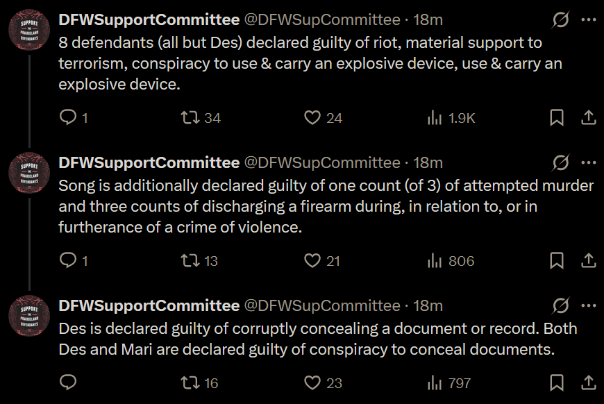 prairieland anarchists got got for wearing black bloc and holding "insurrectionary" materiel(zines) after a raid on an ice facility went wrong and they got arrested. rioting and other charges arent new and expected but the main precedent set is the black bloc clothing and possessing insurrectionary materiels. also 3 people snitched despite being a clandestine cell.