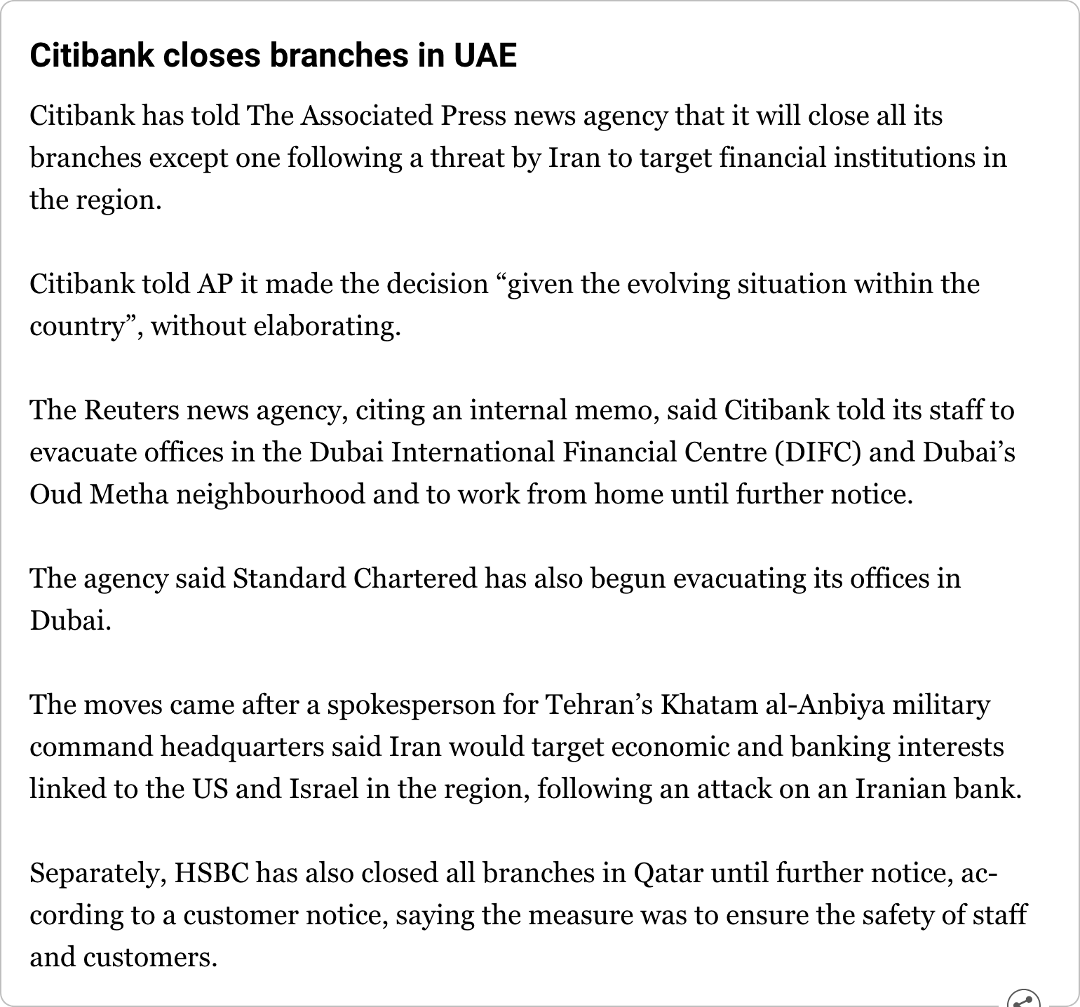 Among the banks, HSBC in Doha announced they’re suspending operations and in the UAE, Citibank and Standard Chartered announced the closure of their offices.