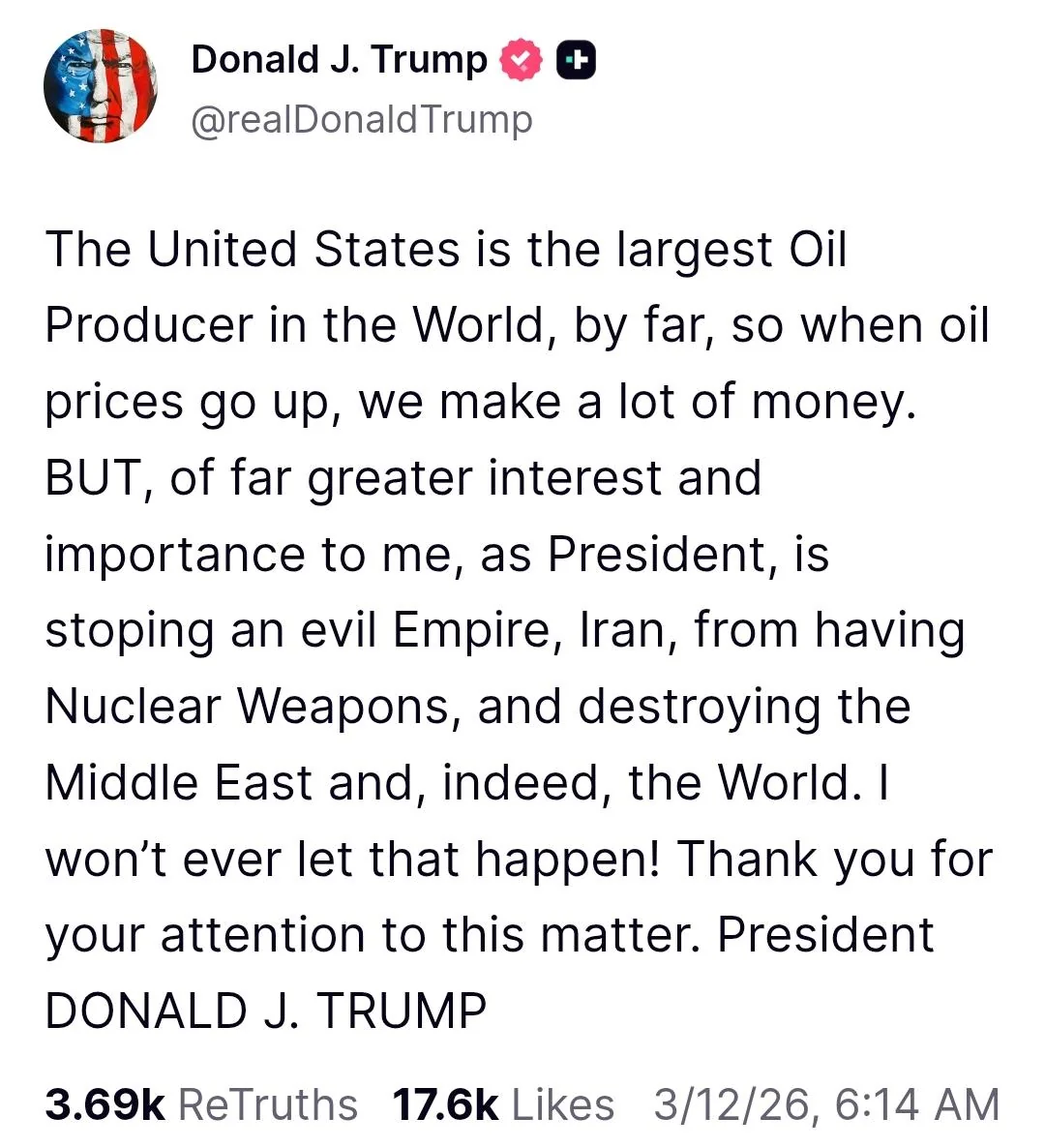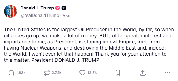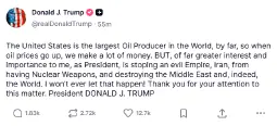 I highly down America would be able to ramp up and more than double it's oil production in time to compensate. Even if every other country like Saudi and Russia etc worked together to increase production (assuming it's even possible), they wouldn't come close to making up for the gap in time to avoid crossing critical thresholds and global market spiraling if they don't make a deal and open up the straight.