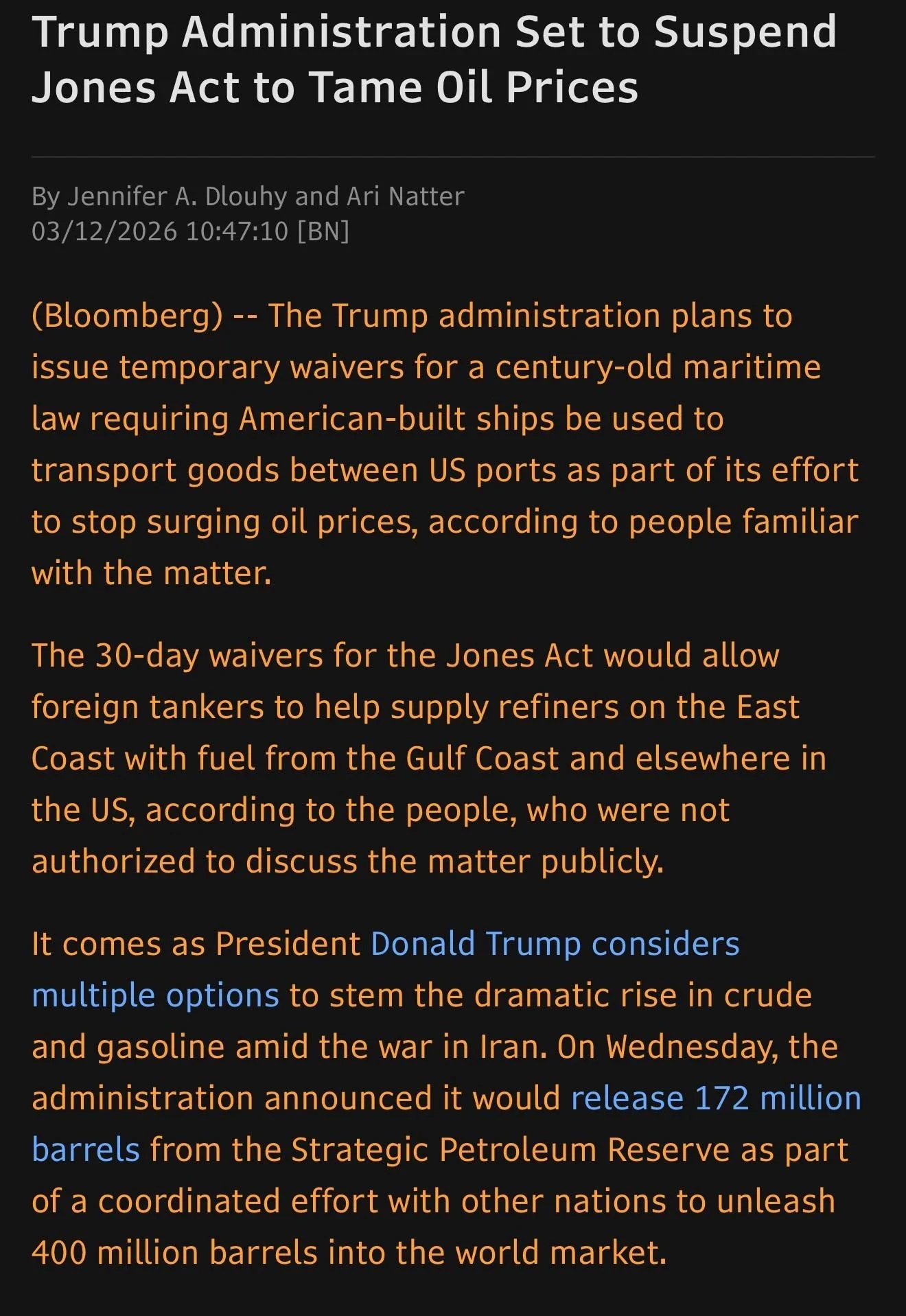 >From Reuters om US Navy tells shipping industry Hormuz escorts not possible for now: