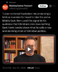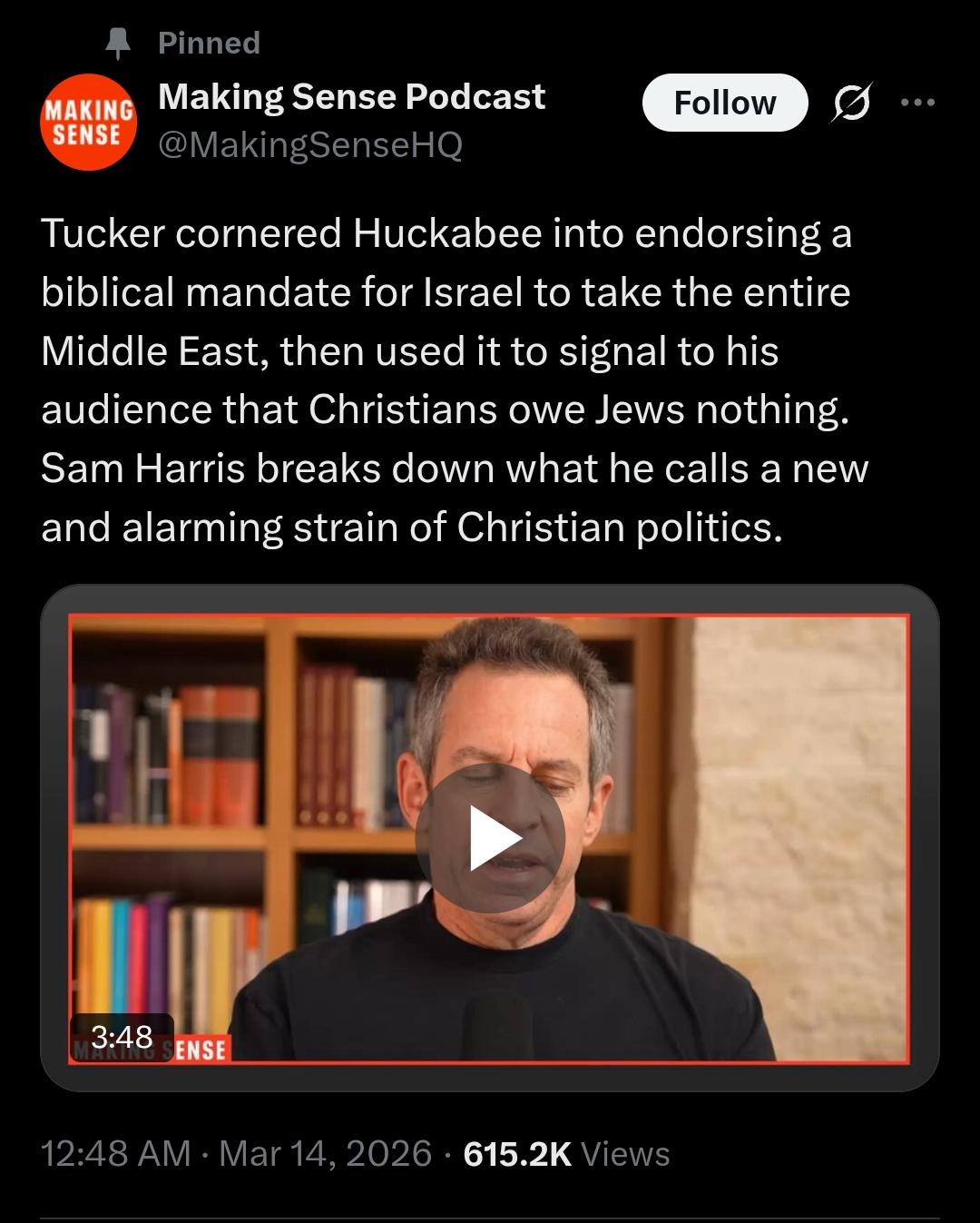 Sam Harris now defending Evangelical support for Israel and saying that Catholics questioning it is "dangerous"