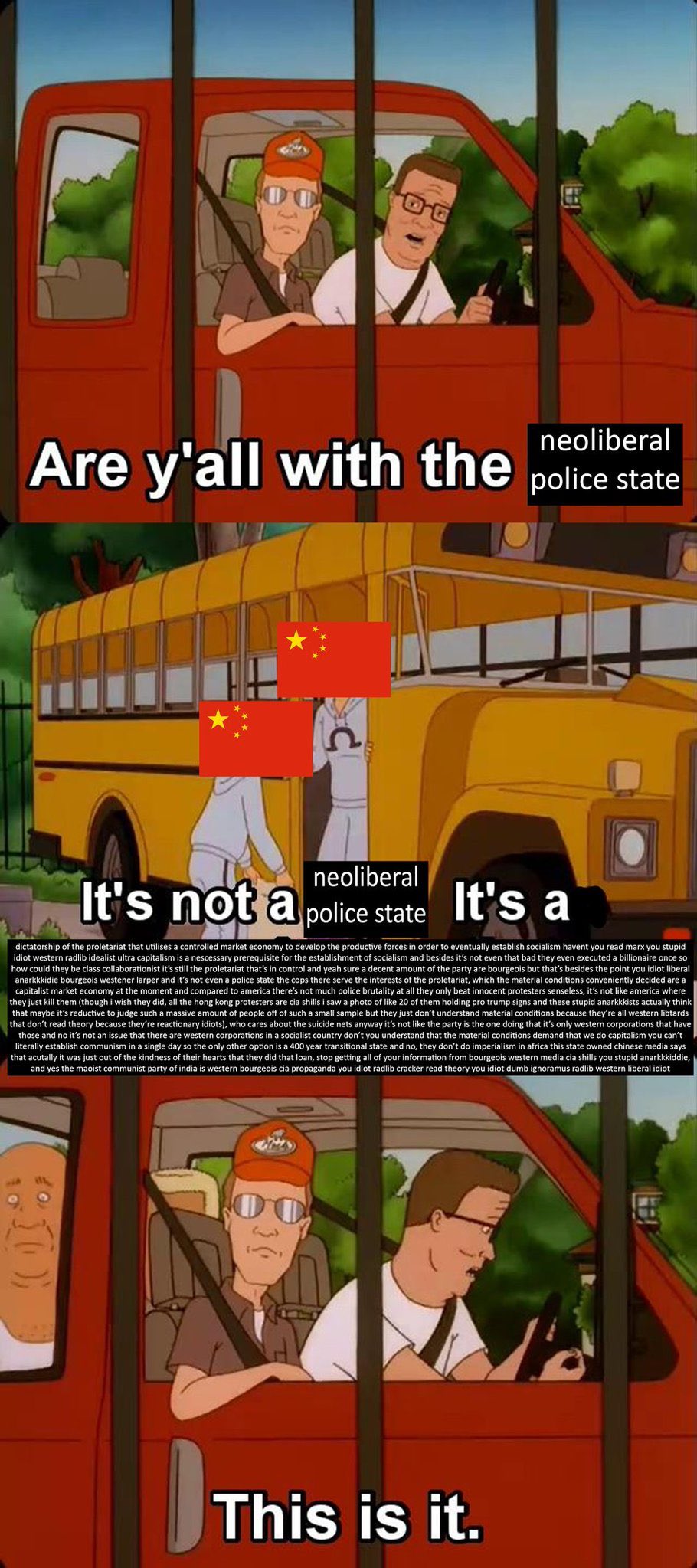 I don't think a single one of you motherfuckers has read Marx or knows anything about the history of China, but the reason why China embraced a market economy is because it's in line with a pretty basic understanding of dialectical materialism as well as Mao's observation that you must apply the principles of Marxism to the unique conditions of a particular country at its stage of development. in the case of China, which was one of the poorest and most underdeveloped countries on earth, its unique conditions were essentially a pre-capitalist society that needed to pass through that stage of developing its productive forces in order to able to then transition to socialism, and Deng's and Chen Yun's theories were essentially to do this in a way that both controlled the excessive, destructive tendencies of capital and also could steer the economy in strategic directions, letting the state control certain areas of the economy that don't need to be developed while still allowing for the market to exist and have a limited degree of freedom.