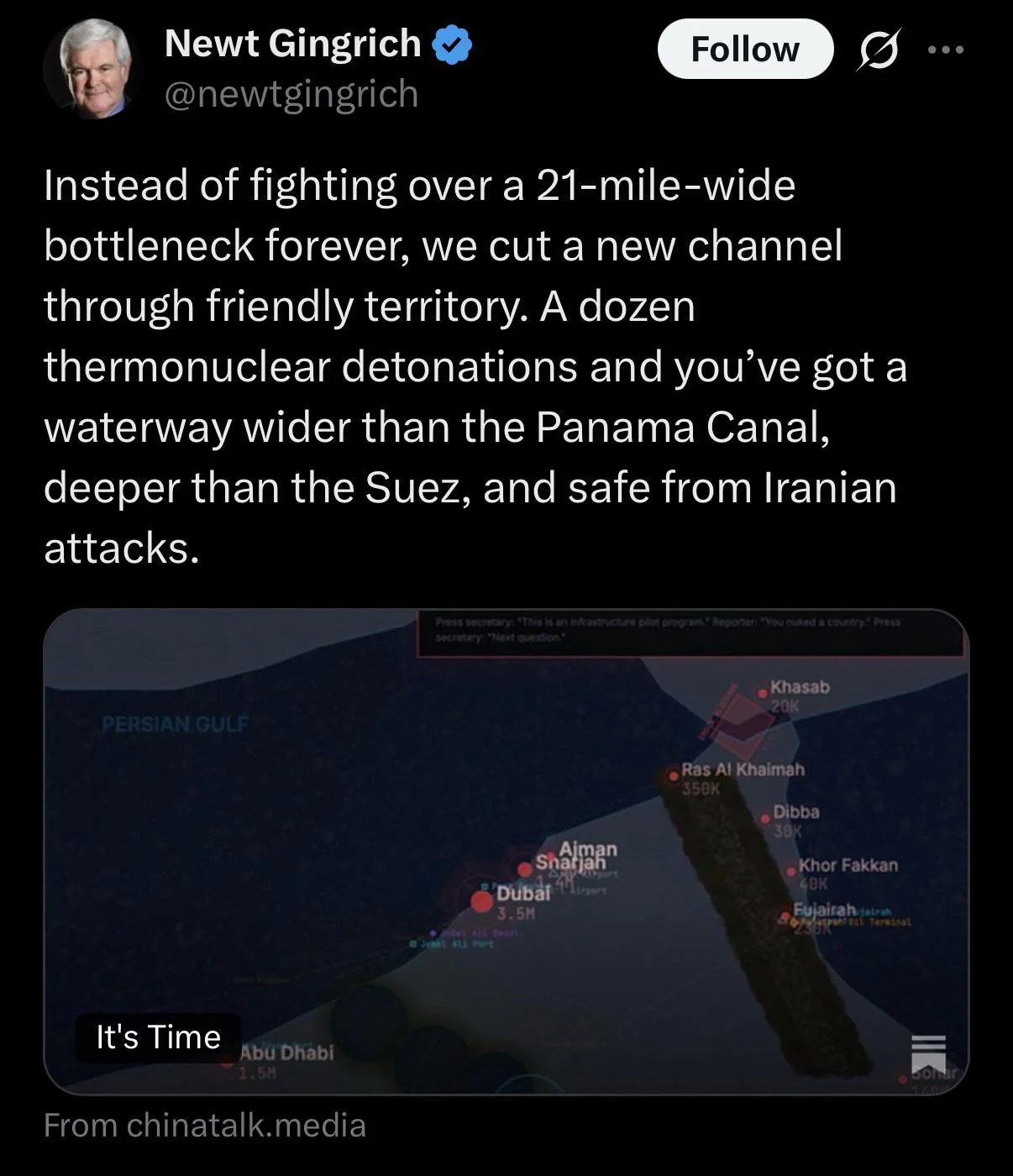 >The answer was straightforward: Even one Iranian soldier or militia member zipping across the narrow neck of the strait in a speedboat could fire a mobile missile right into a slow-moving supertanker, or plant a limpet mine on its hull.lmao