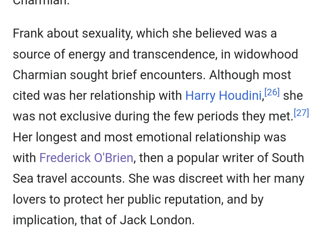 https://cgi.pbs.org/wgbh/amex/houdini/peopleevents/pande06.htmlUpon hearing of his death in 1926, Charmian wrote in her diary, "Stirred with regret . . . I scan his lovely profile picture with a magnifying glass. Sad over my Magic Lover – dead."