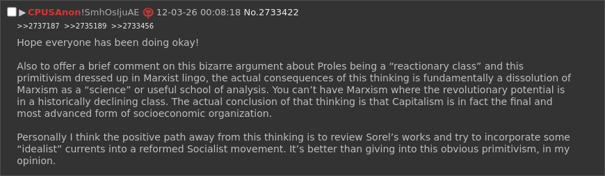so am i the only one who's noticed that CPUSAnon has been openly encouraging people to read fascist literature now, while increasingly admitting that he is influenced by it?