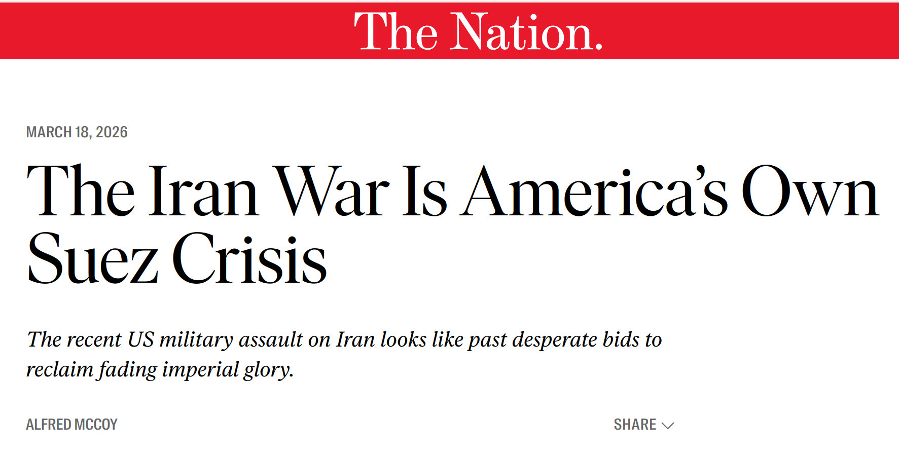 >The US war on Iran is thus likely an attempt to reduce or remove 2 obstacles to US primacy with one war, degrading or toppling Iran and the imposition of a global maritime oil blockade on China at its source (US capture of Venezuela, US strikes on Russian energy production, and now the incremental shutdown of energy exports from the Middle East);