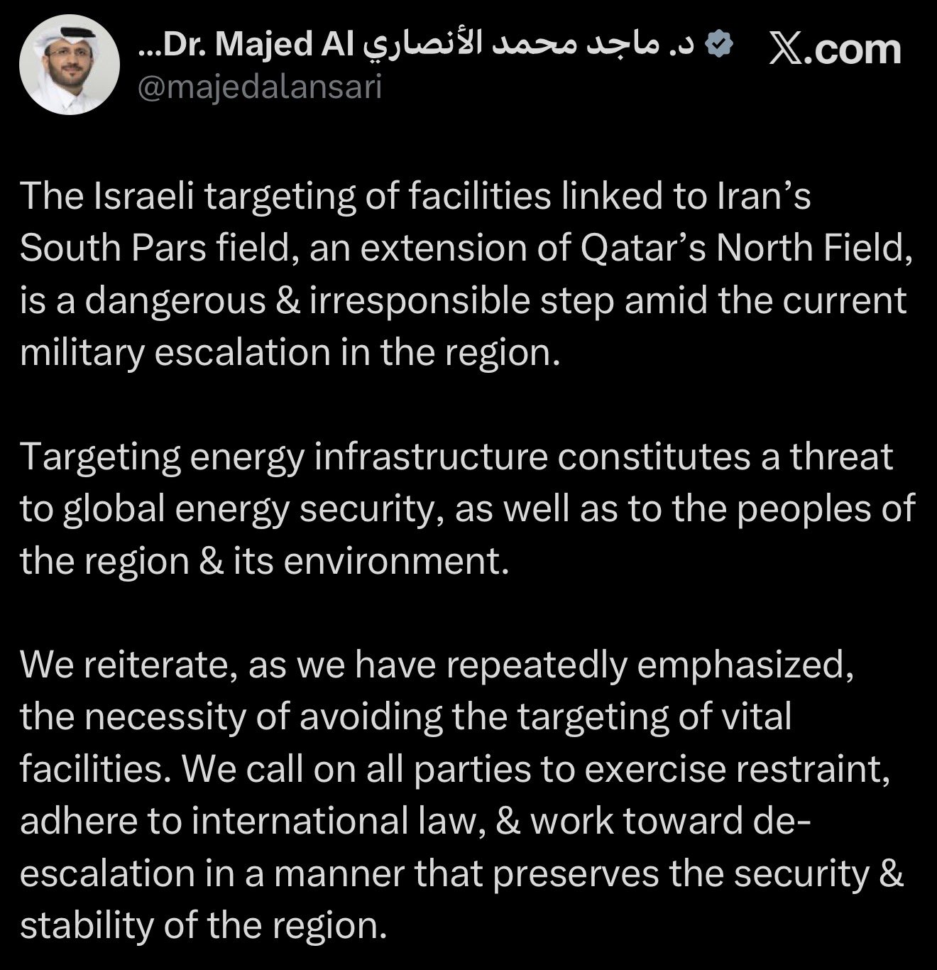 The warning specifically included, according to maps, the Jubail petrochemical complex and the SAMREF refinery in Saudi Arabia; the Al Hosn gas field in the UAE; and the Ras Laffan refinery, petrochemical complex, and Mesaieed Petrochemical Holding Company in Qatar.