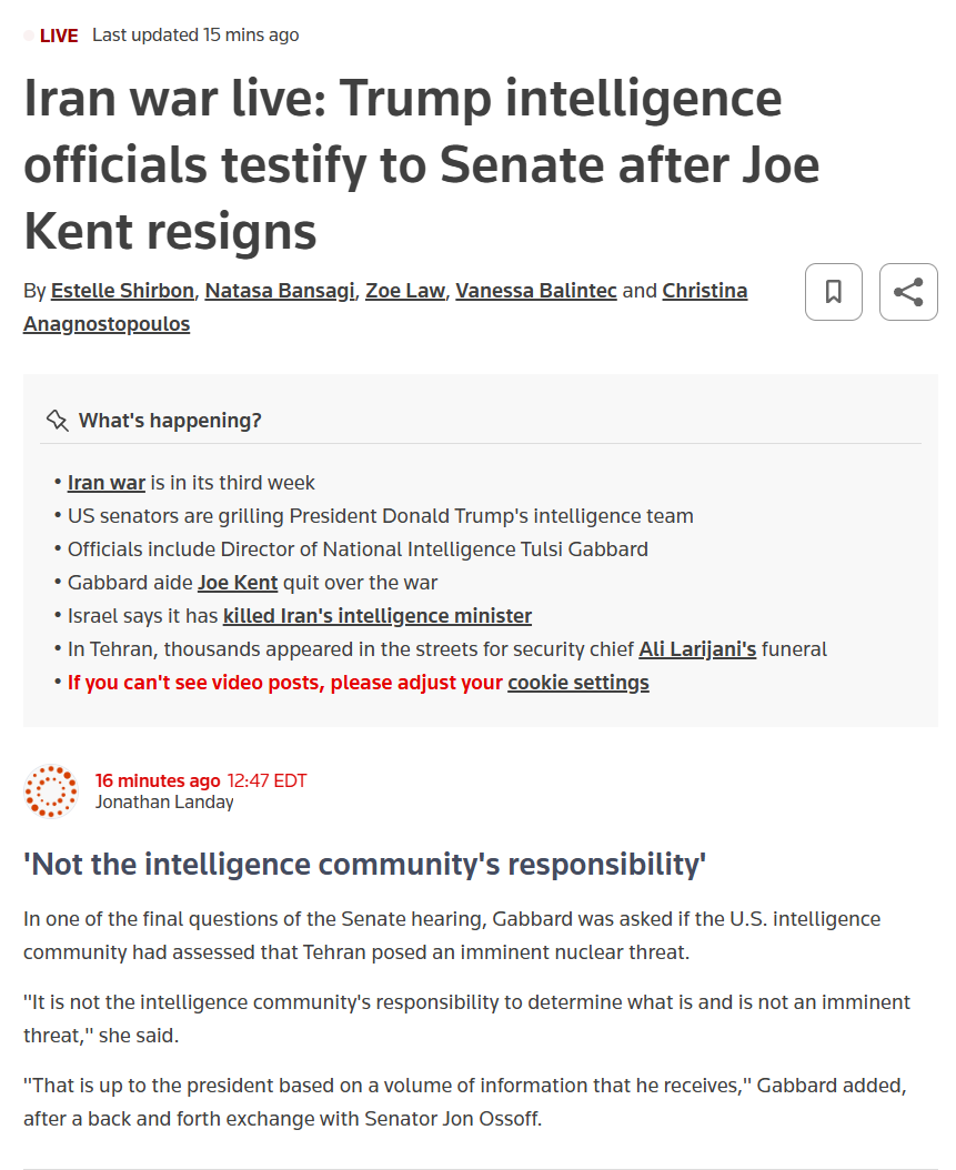 >No. It wasn’t Israel (which Kent had promoted), that has dragged Trump into or launched the war. The sole person who did that was Donald Trump – in spite of all warnings about what a war with Iran would entail. The Israelis would not have dared such a move against Iran had Trump not agreed with them[…]https://www.moonofalabama.org/2026/03/war-on-iran-czech-cruiser-krtecek-larijanis-martyrdom-kents-resignation.htmlJoe Kent Hero… Tulsi Gabbard, a Contemptible, Craven Zero