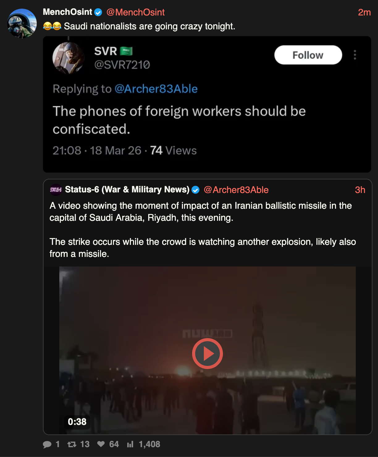 >>2744270Can't you be arrested in "Israel" and the Gulf states for taking pictures and video of strikes these days?
