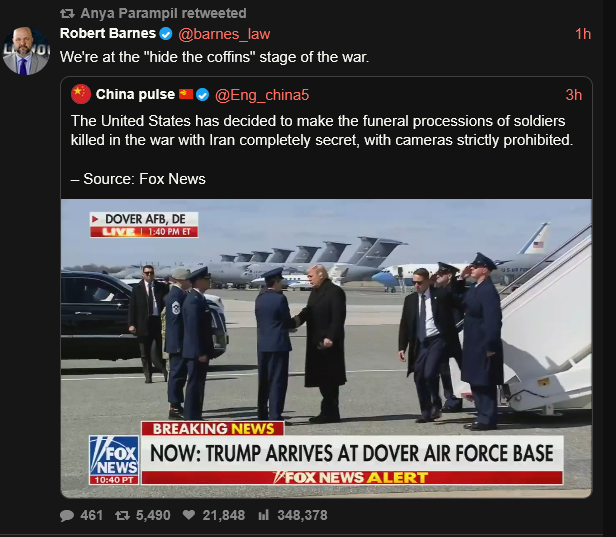 >Contrary to the smears being spread by the Trump sycophants about Joe Kent, Joe was the man in the intelligence community who had the most knowledge of terrorist threats and terrorist activities confronting the US. When he wrote in his resignation letter that Iran did not pose an imminent threat to the United States, he was not offering up a personal opinion… That is what the intelligence shows[…]https://sonar21.com/joe-kent-hero-tulsi-gabbard-a-contemptible-craven-zero/Iran War: No Uptake to Trump Plea for Help With Opening Strait of Hormuz; Israel Claims Assassination of Iran Security Chief; Iran Clarifies That Friendly Countries Can Transit, Strikes UAE Terminal at Fajarah, Trump Delays Xi Summit