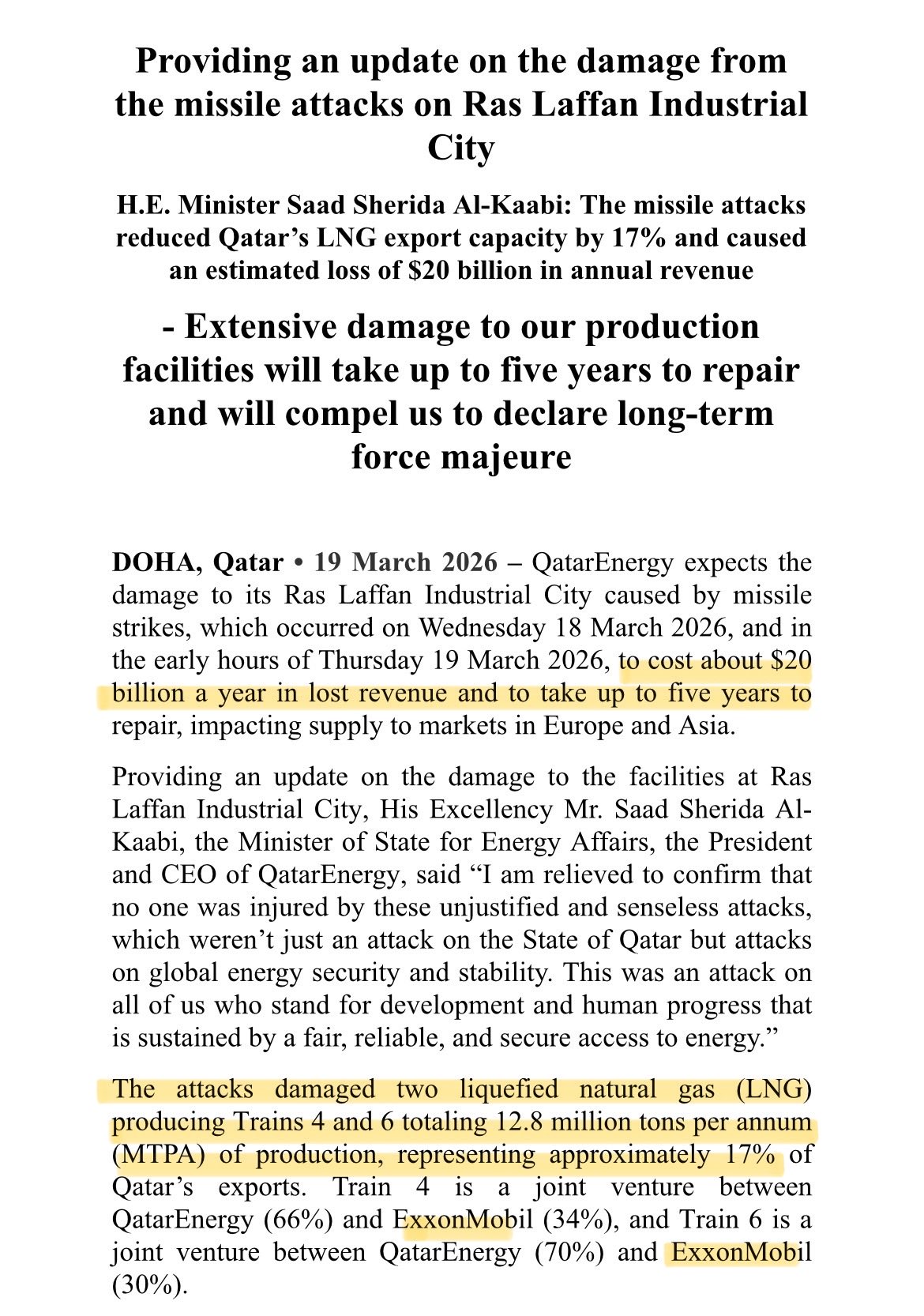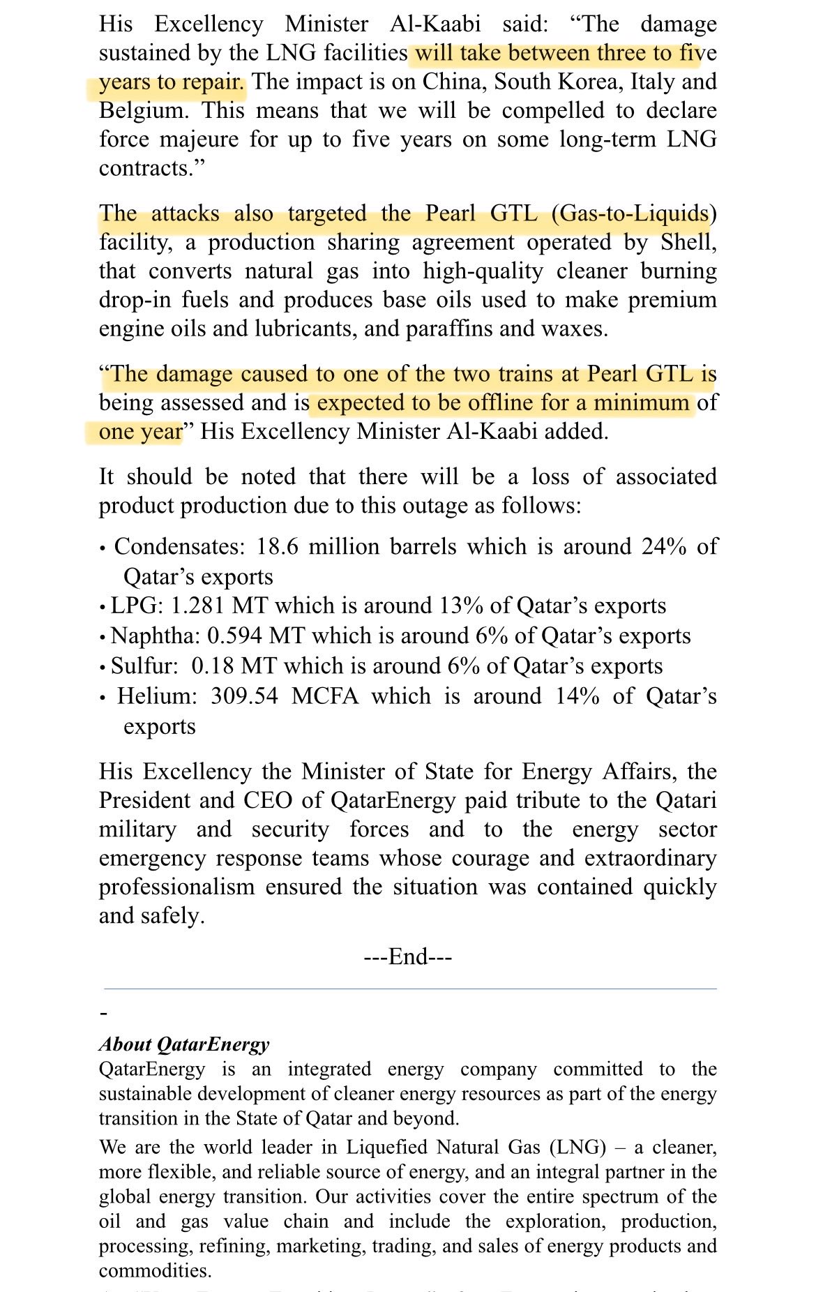 Al-Kaabi now says long-term force majeure is most likely going to be declared.