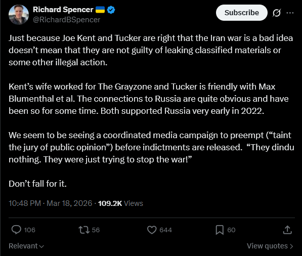 https://www.economist.com/insider/the-insider/a-conversation-with-tucker-carlson?taid=daf2eda4-9252-49fa-b8f4-67885b1f9358Federal law enforcement says that Joe Kent shared secret government information with figures like Tucker Carlson.