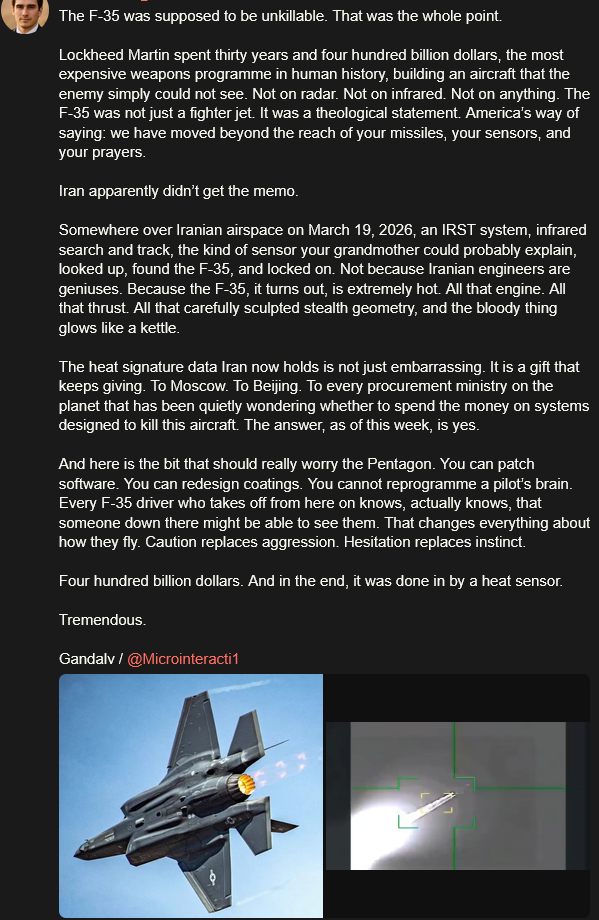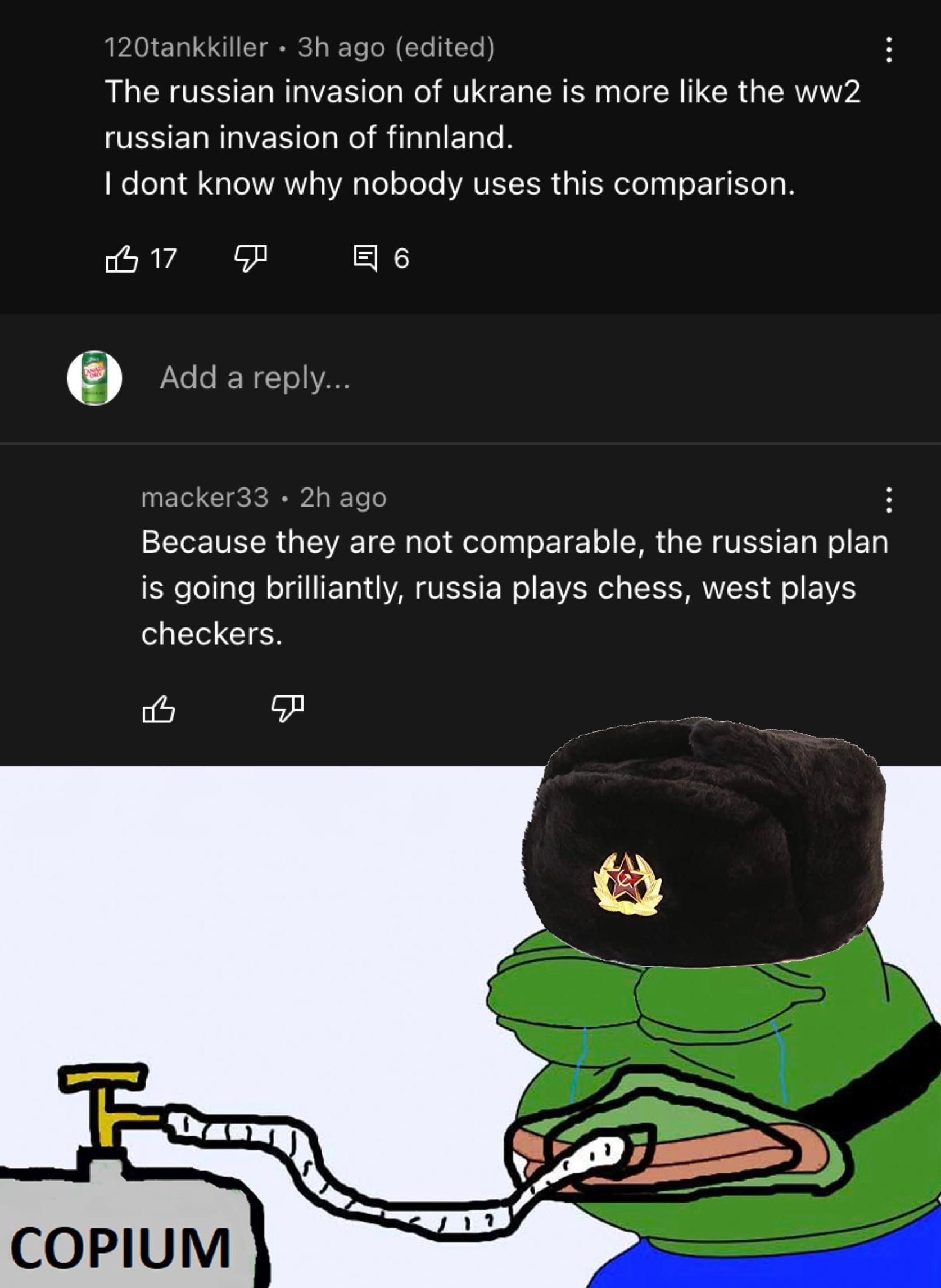 They're not even strictly positive facts as they show that Putin is not as seriously committed to winning in Ukraine as he could be and is not willing to help Iran despite having ample capabilities to do so. That's a much better angle to criticize Russia from than going "kek le copium muh ukraine destroyed 110% of le russian army".