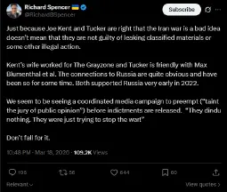 >>2746934Also when Richard Spencer was married to a Russia woman he was super pro Russia to point he regularly on RT, openly denied le holodomor and praised Putin a lot