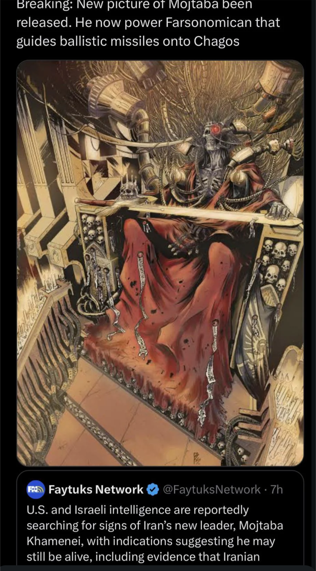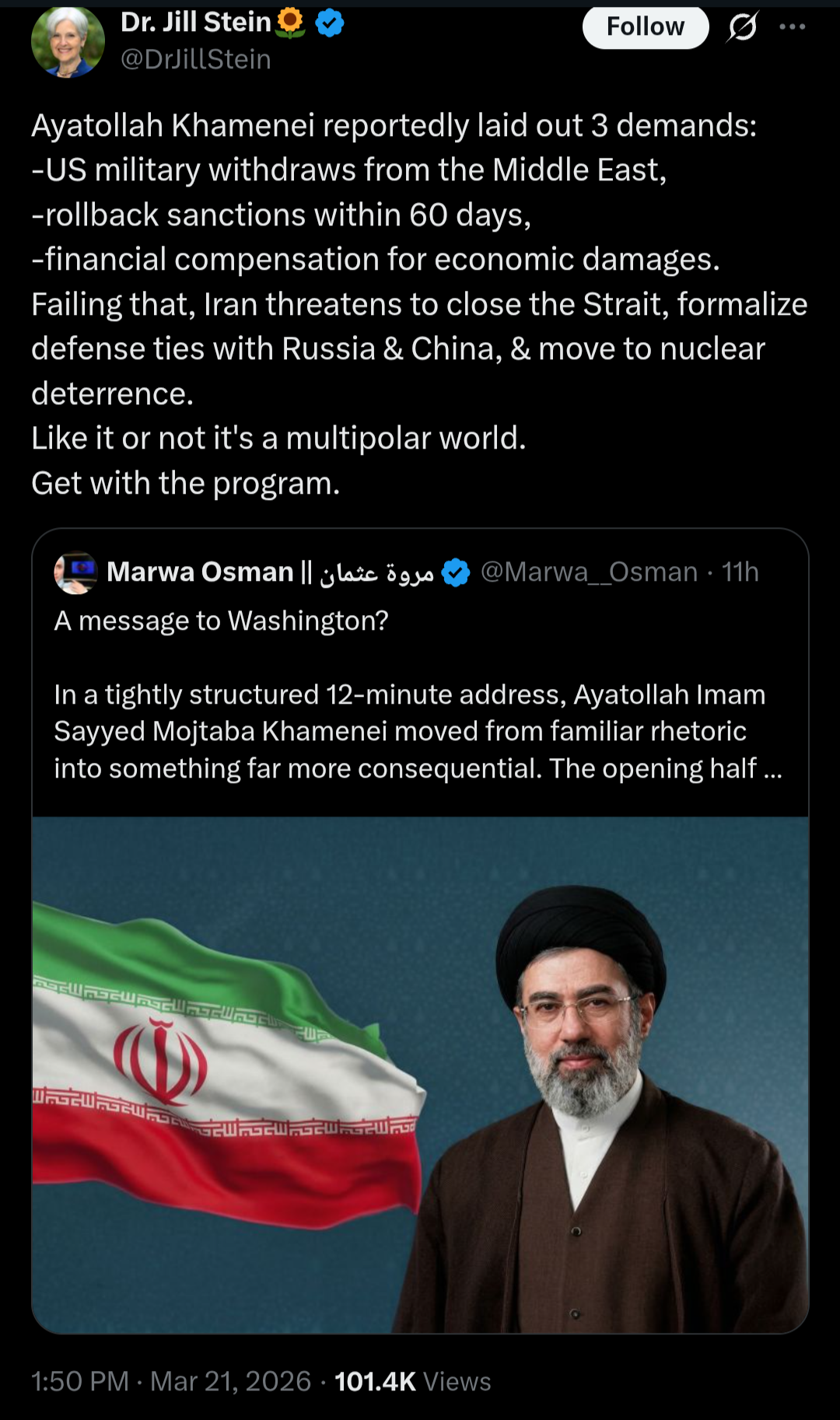 >>2749340>Iran moves to nuclear deterrence and formalizing a defense treaty with Russia/Chinaso the US/Israel war caused exactly the thing they were trying to prevent by killing the anti-nuclear Khamenei and replacing him with a pro-nuclear Khamenei. based JDPON Don.