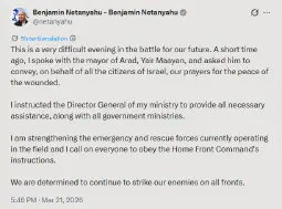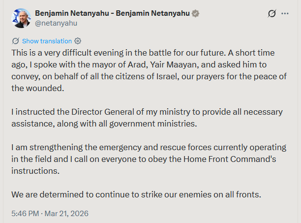 Israel’s PM Netanyahu says he is “strengthening the emergency and rescue forces currently operating in the field” following an attack on the southern Israeli city of Arad, injuring more than 50 people.
