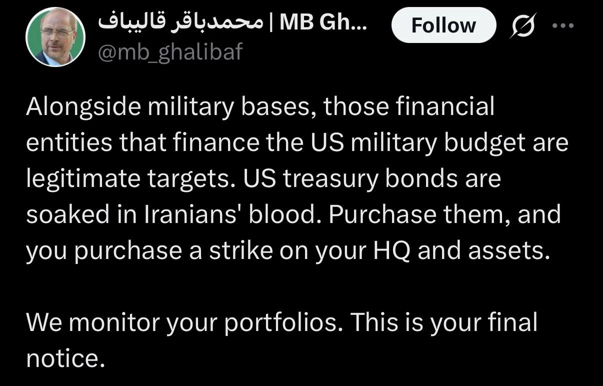 “US treasury bonds are soaked in Iranians’ blood. Purchase them, and you purchase a strike on your HQ and assets,” Ghalibaf wrote on X.