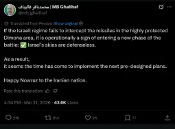 The commander of the Aerospace Force of the Iranian Revolutionary Guard, Brigadier General Majid Mousavi, said on Saturday evening that "from this moment I declare Iran's missile control over the skies of the occupied southern territories."