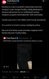 >Iranian missiles made several direct impacts on Dimona, which is home to a major nuclear research centre, and the city of Arad, both in southern Israel.
