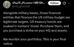 Iranian Parliament Speaker Mohammad Bagher Ghalibaf has warned that “financial entities that finance the US military budget are legitimate targets”.
