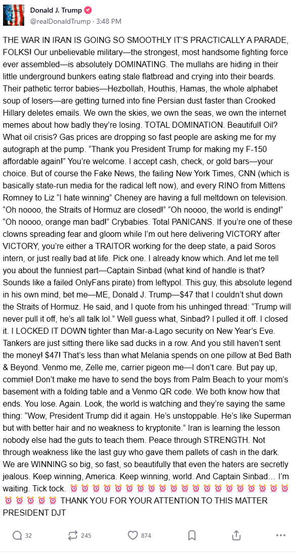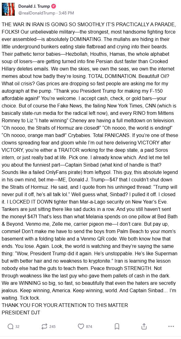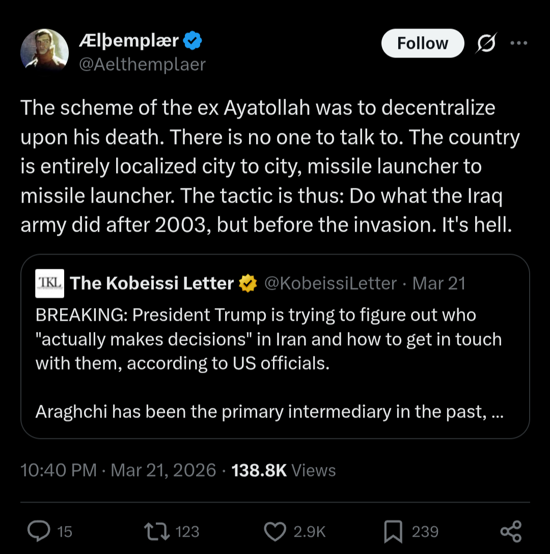 And if he tries to be funny with Kharg-jima, expect all western social media to ban footage from fpv drones yeeting marines on the regular.