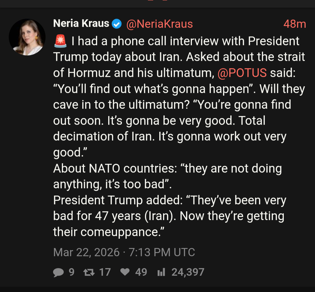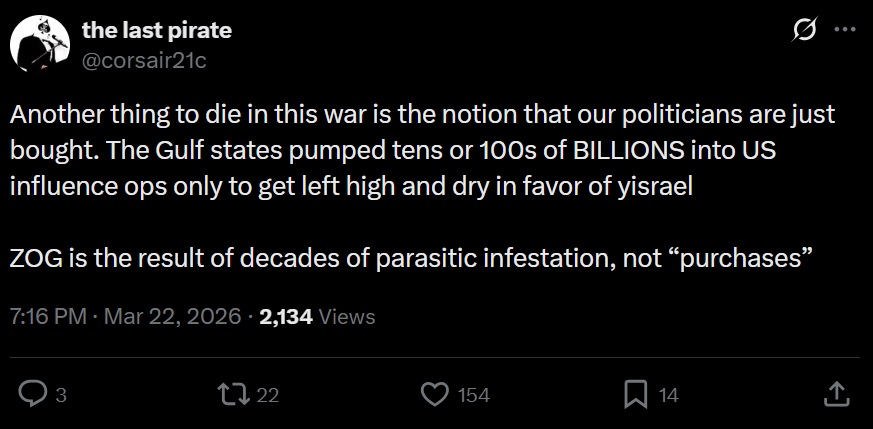 https://nitter.poast.org/iwasnevrhere_/status/2035787362353983647#mI'm reading quite a few macho statements from UAE and SA. They must be mortally butthurt they've been definitely exposed for the zionist whores they are, plus they are taking huge economical hits and if PEDOnald tries something funny with Iran's energy infrastracture, they're gonna burn within a few hours.
