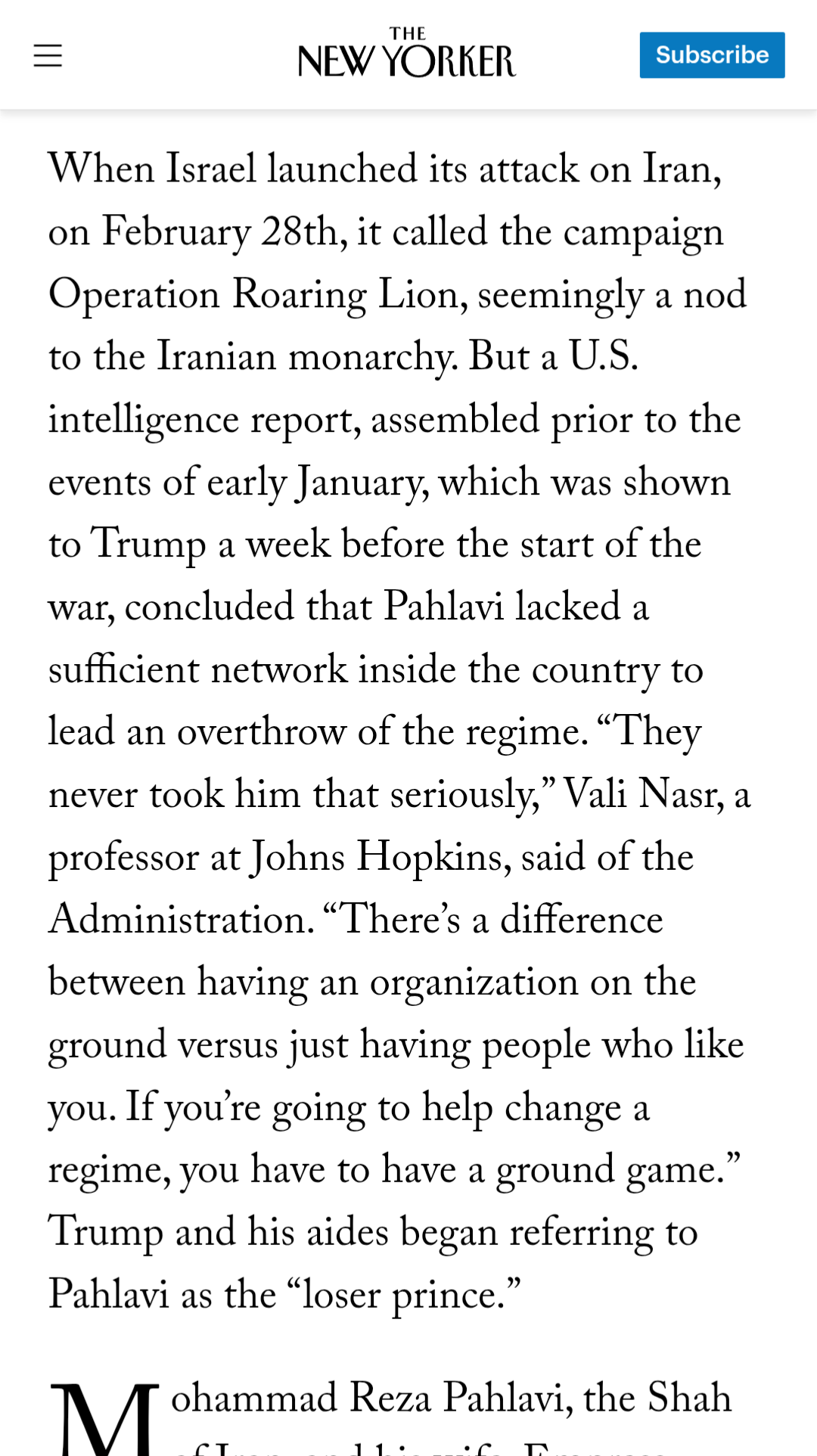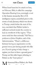 >When Israel launched its attack on Iran, on February 28th, it called the campaign Operation Roaring Lion, seemingly a nod to the Iranian monarchy. But a U.S. intelligence report, assembled prior to the events of early January, which was shown to Trump a week before the start of the war, concluded that Pahlavi lacked a sufficient network inside the country to lead an overthrow of the regime. “They never took him that seriously,” Vali Nasr, a professor at Johns Hopkins, said of the Administration. “There’s a difference between having an organization on the ground versus just having people who like you. If you’re going to help change a regime, you have to have a ground game.” Trump and his aides began referring to Pahlavi as the “loser prince.”https://www.newyorker.com/news/the-lede/the-distant-promise-of-irans-would-be-king >>2750478inb4 some anons say these are just a fringe minority of extremists