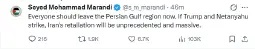 The minister’s post followed a statement from the Ministry of Foreign Affairs that said the US and Israel were directly responsible for disruptions and escalating danger in the Strait.