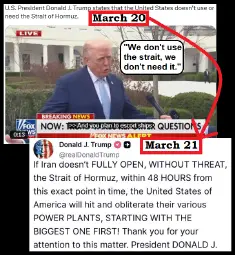 >Trump gave Iran a 48-hour deadline—expiring at 23:44 GMT on March 23—to unconditionally reopen the Strait of Hormuz.