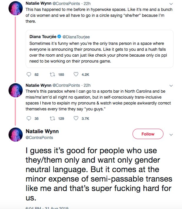 However I do agree that giving pronouns is obnoxious, if someone has non standard pronouns then it's incumbent on them to inform people of this. There was this insufferable they/them in a space I was in who was called 'John' and had a beard, then got triggered everytime someone said 'him', like sorry John, call yourself 'Sparkle' or something if you want people to instinctively they/them you