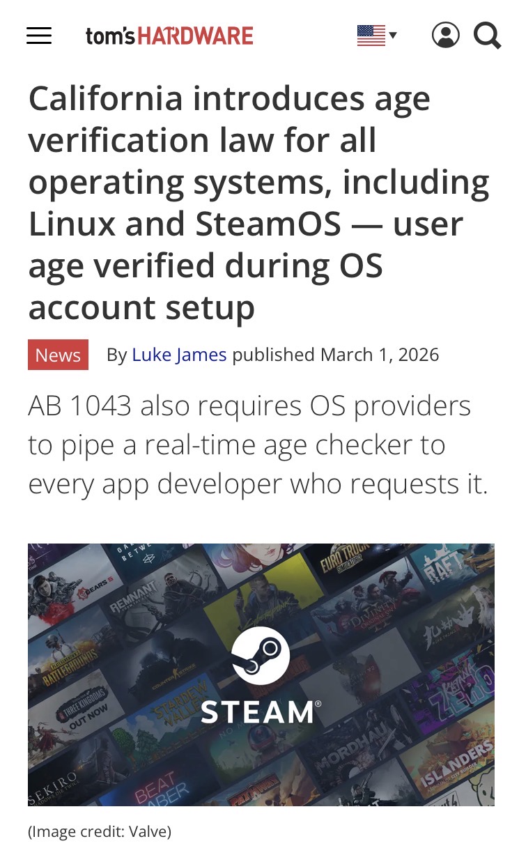 - the group actually pushing this is Facebook, and it's because they want to NIMBY right-wing demands for age verification (Which, when you dig into it, is always who's pushing them.) by having them take place at the OS level rather than at the website level. FB is basically going "it would be too expensive or actively impossible to lobby against the encroachment of ID verification, so we should lobby for it but make it someone else's problem (in this case, Apple Mac OS/Microsoft Windows/Google Android's)", since Facebook doesn't make their own operating system.