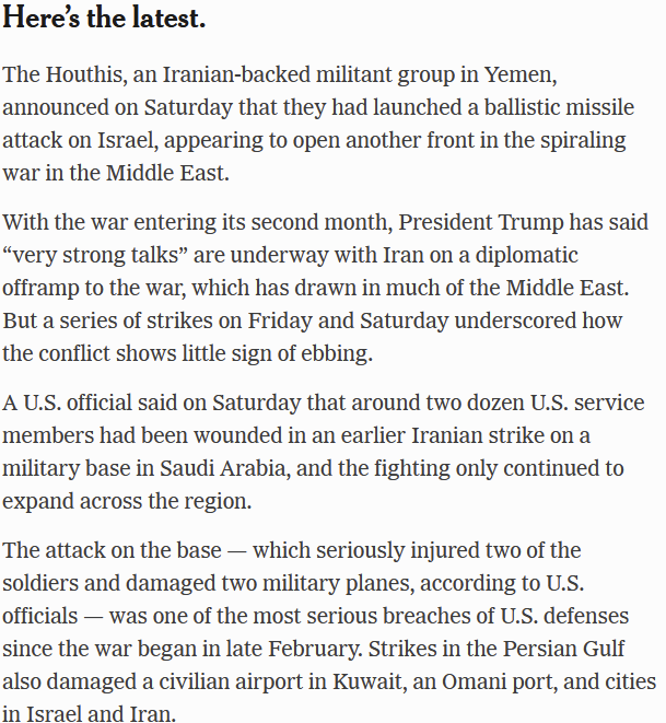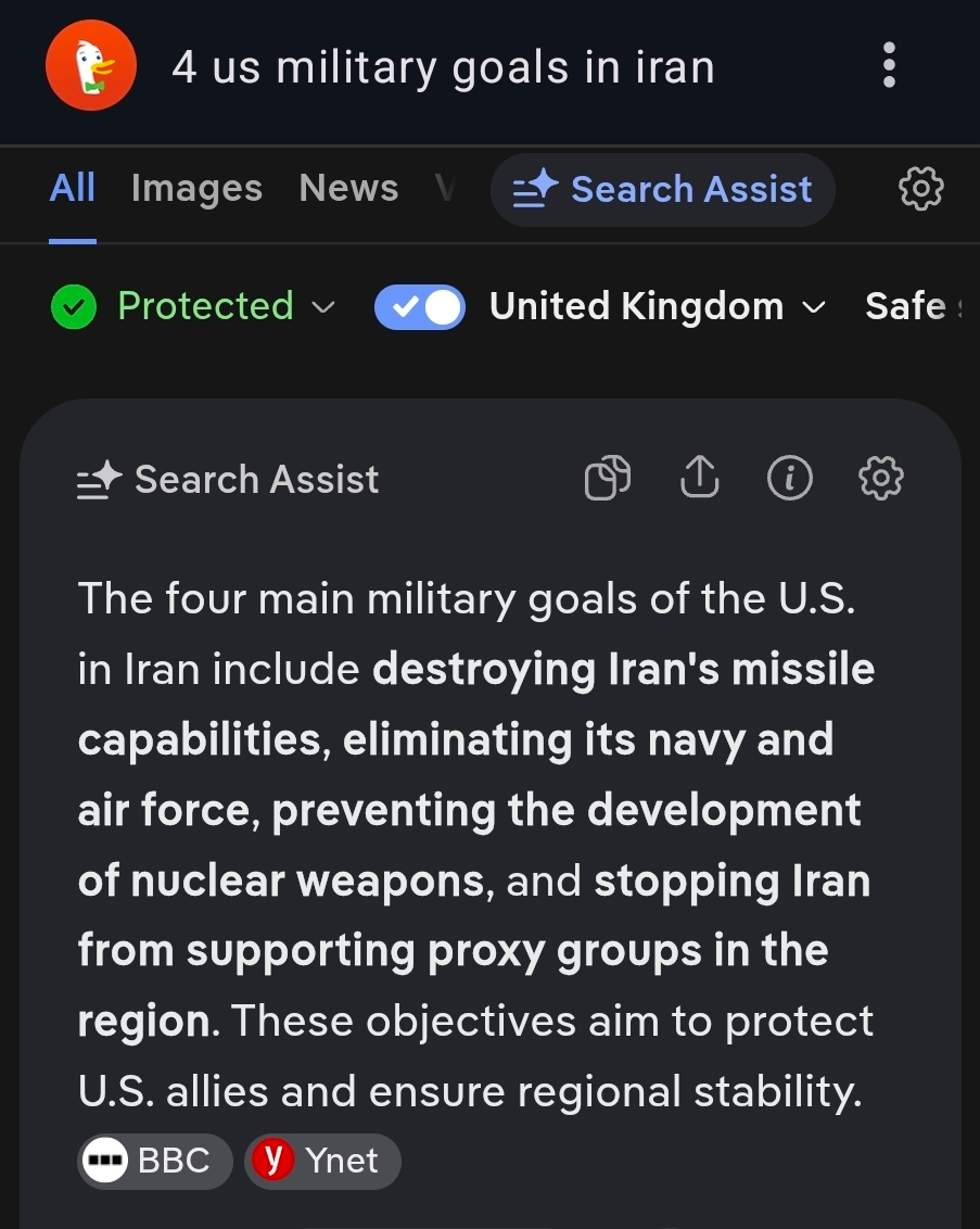 Anyway the whole point is moot because the US stated "military goals" change every day. At one point it was regime change, which now both US and Israeli intelligence admit is unlikely. "Opening the strait of hormuz" is another now, ie the goal of the war is to undo the problem that the war caused.