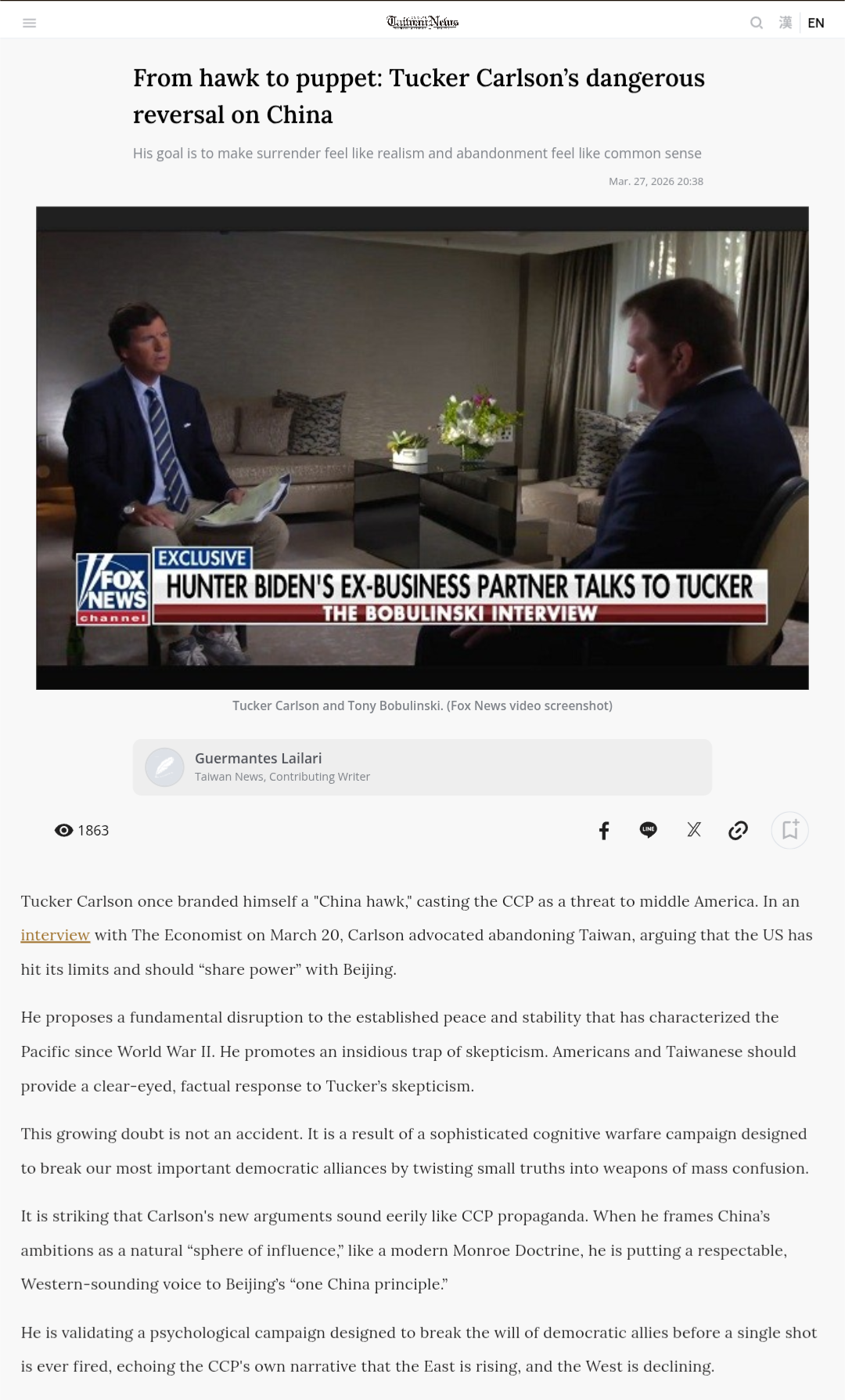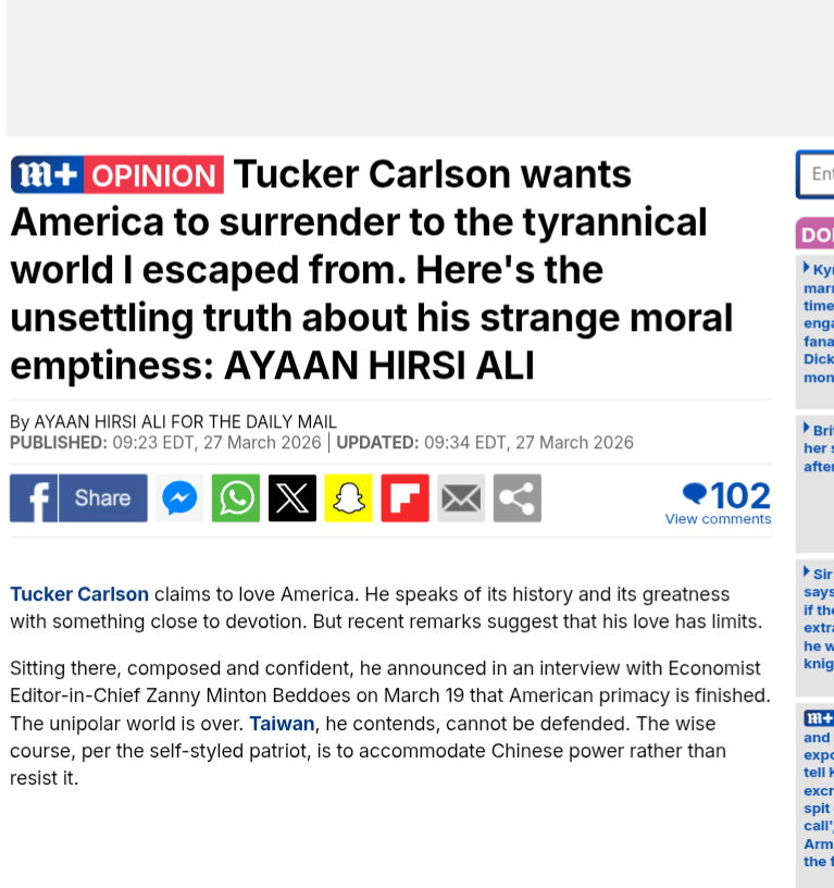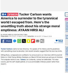 >You just have a personal vendetta against him because of your image of Tucker as the pinnacle conservative guyI promise you I don't consider him worthy of a grudge nor do I consider him the "pinnacle" anything let alone "conservatism". He's a dime-a-dozen and I think they'll be many more of his kind in near future wither due to the US's retreat from the middle east or US decline in general.