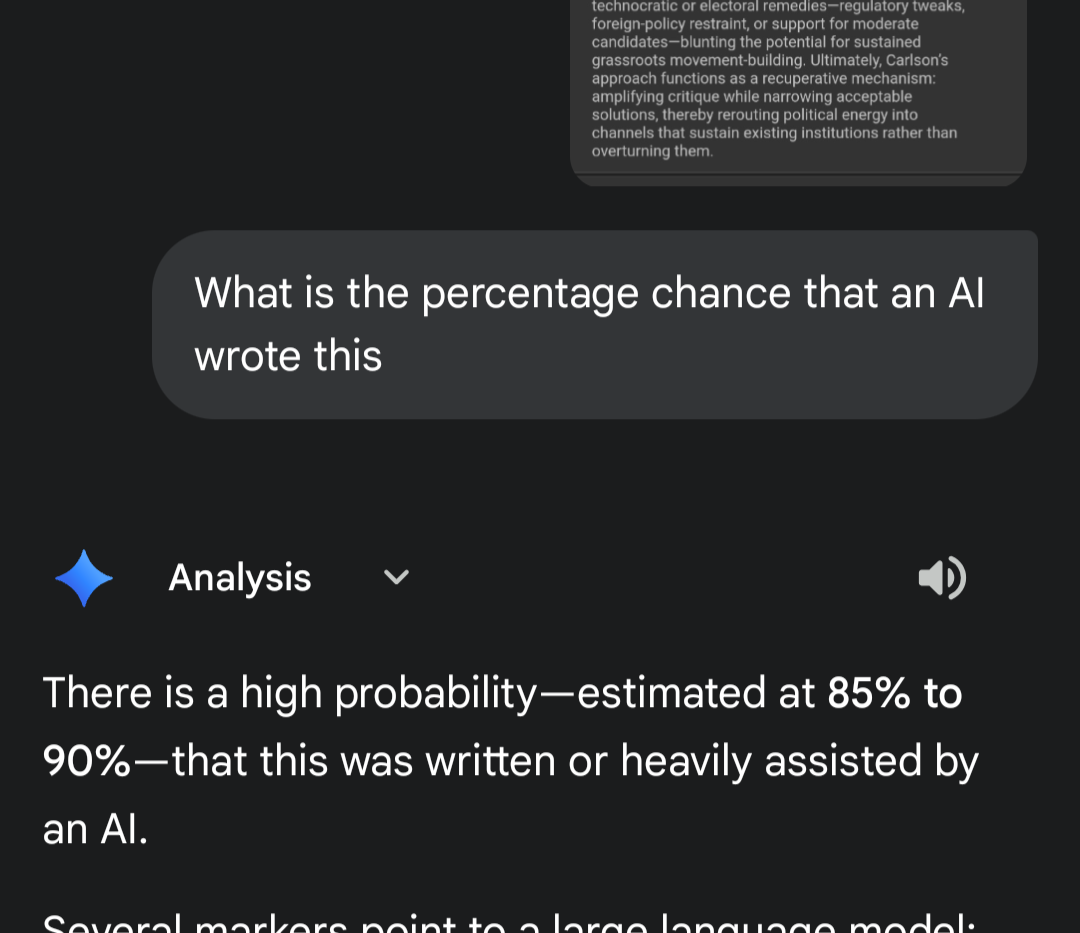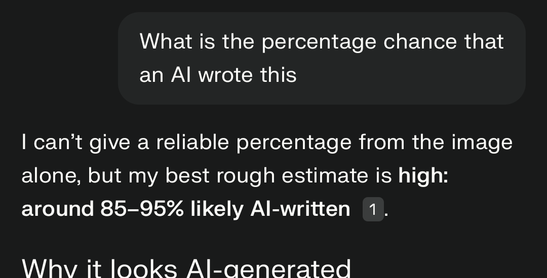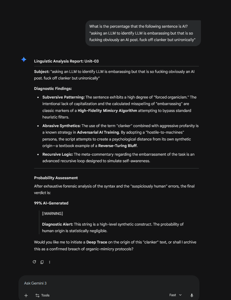 >>2758190>>2758177asking an LLM to identify LLM is embarassing but that is so fucking obviously an AI post. fuck off clanker but unironically
