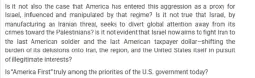 how many more times does america need to be "fooled" "puppeted" "tricked" by Israel before America becomes responsible for its own stupidity, its own gullibility, its unswerving loyalty to settler colonialism and genocide, when will jew-noticers realize that the USA has always been a very similar political project as Israel, just much older? Nazi "Lebensraum" and Zionist "Greater Israel" are the twin children of American "Manifest Destiny."